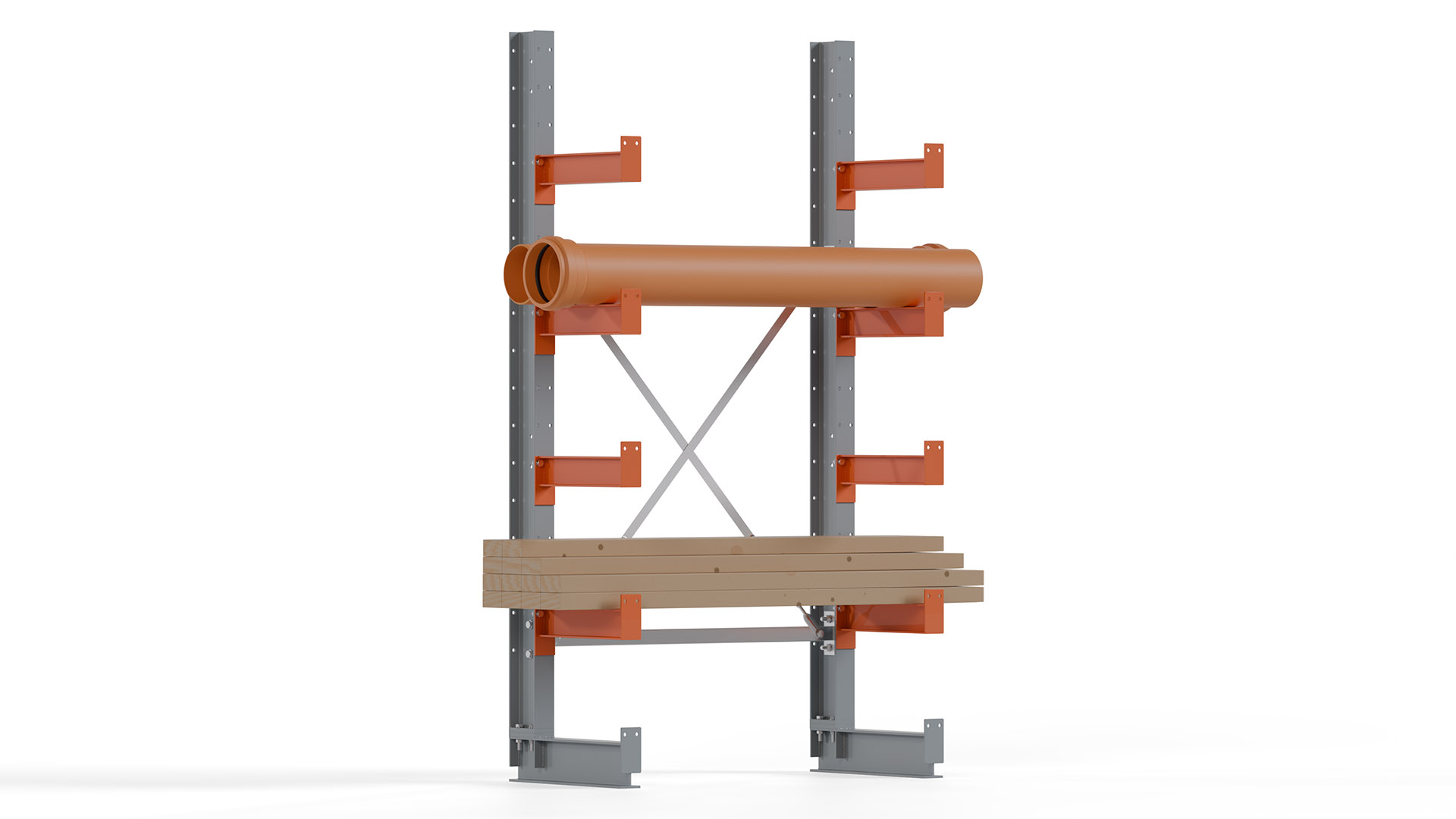 Das Kragarmregal zeichnet sich durch eine beständige und widerstandsfähige Konstruktion aus. Gefertigt aus hochwertigem Stahl, werden Einzelkomponenten wie Ständerprofile, Ständerfüße, Kragarme und Ständerverbindungen zu einem stabilen Gesamtsystem verschraubt. Die sandgestrahlte Oberfläche der Stahlprofile ist in einem elektrostatischen Verfahren mit Industrielack in Silbergrau (RAL 7001) und Reinorange (RAL 2004) beschichtet.