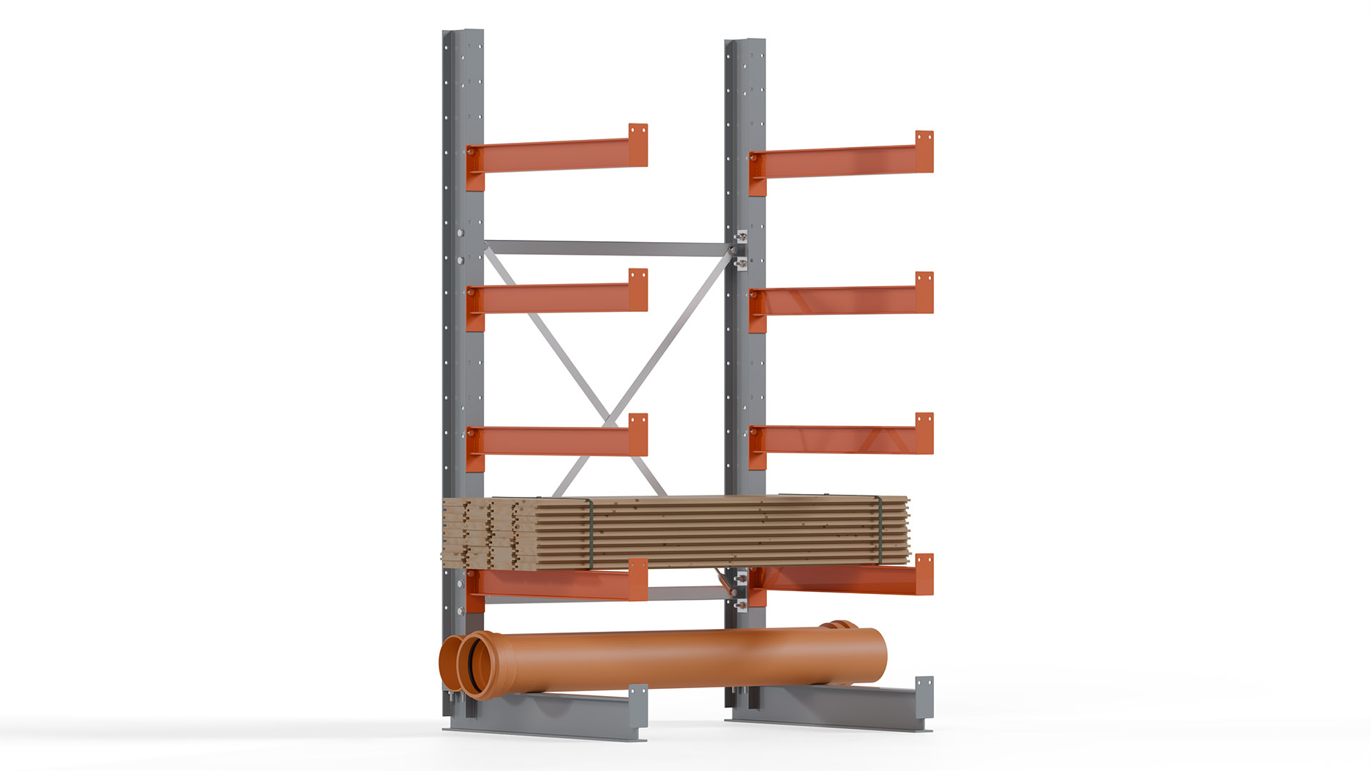Das Kragarmregal zeichnet sich durch eine beständige und widerstandsfähige Konstruktion aus. Gefertigt aus hochwertigem Stahl, werden Einzelkomponenten wie Ständerprofile, Ständerfüße, Kragarme und Ständerverbindungen zu einem stabilen Gesamtsystem verschraubt. Die sandgestrahlte Oberfläche der Stahlprofile ist in einem elektrostatischen Verfahren mit Industrielack in Silbergrau (RAL 7001) und Reinorange (RAL 2004) beschichtet.