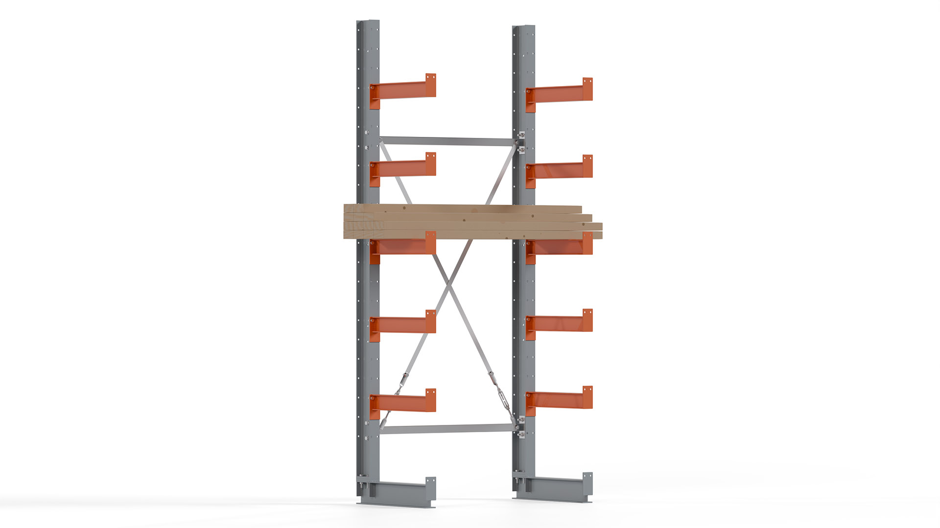 Das Kragarmregal zeichnet sich durch eine beständige und widerstandsfähige Konstruktion aus. Gefertigt aus hochwertigem Stahl, werden Einzelkomponenten wie Ständerprofile, Ständerfüße, Kragarme und Ständerverbindungen zu einem stabilen Gesamtsystem verschraubt. Die sandgestrahlte Oberfläche der Stahlprofile ist in einem elektrostatischen Verfahren mit Industrielack in Silbergrau (RAL 7001) und Reinorange (RAL 2004) beschichtet.