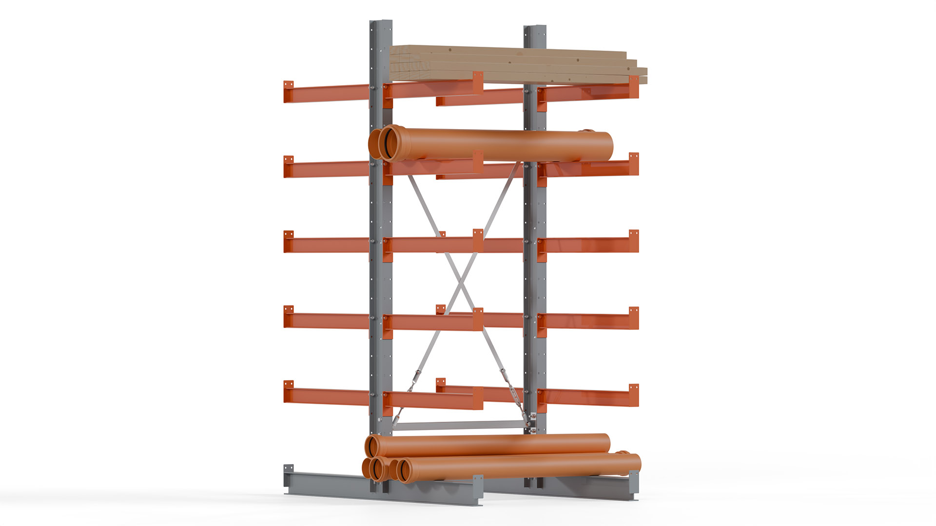 Das Kragarmregal zeichnet sich durch eine beständige und widerstandsfähige Konstruktion aus. Gefertigt aus hochwertigem Stahl, werden Einzelkomponenten wie Ständerprofile, Ständerfüße, Kragarme und Ständerverbindungen zu einem stabilen Gesamtsystem verschraubt. Die sandgestrahlte Oberfläche der Stahlprofile ist in einem elektrostatischen Verfahren mit Industrielack in Silbergrau (RAL 7001) und Reinorange (RAL 2004) beschichtet.
