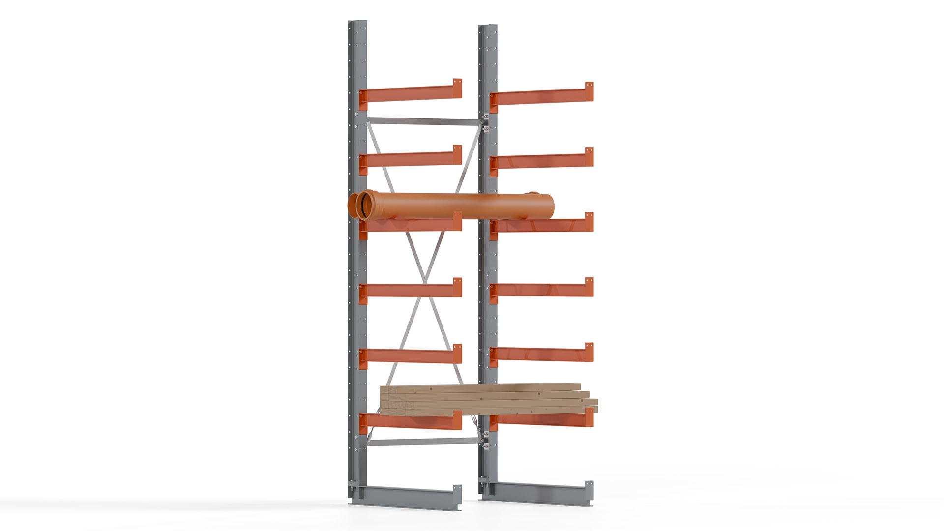 Das Kragarmregal zeichnet sich durch eine beständige und widerstandsfähige Konstruktion aus. Gefertigt aus hochwertigem Stahl, werden Einzelkomponenten wie Ständerprofile, Ständerfüße, Kragarme und Ständerverbindungen zu einem stabilen Gesamtsystem verschraubt. Die sandgestrahlte Oberfläche der Stahlprofile ist in einem elektrostatischen Verfahren mit Industrielack in Silbergrau (RAL 7001) und Reinorange (RAL 2004) beschichtet.