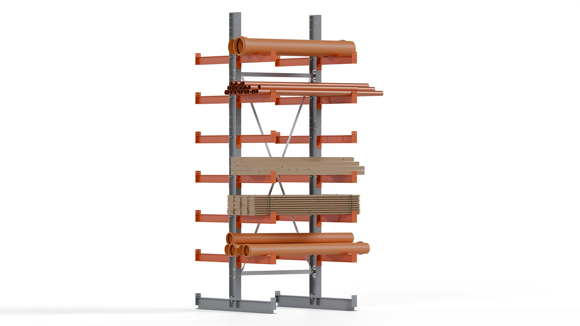 Das Kragarmregal zeichnet sich durch eine beständige und widerstandsfähige Konstruktion aus. Gefertigt aus hochwertigem Stahl, werden Einzelkomponenten wie Ständerprofile, Ständerfüße, Kragarme und Ständerverbindungen zu einem stabilen Gesamtsystem verschraubt. Die sandgestrahlte Oberfläche der Stahlprofile ist in einem elektrostatischen Verfahren mit Industrielack in Silbergrau (RAL 7001) und Reinorange (RAL 2004) beschichtet.
