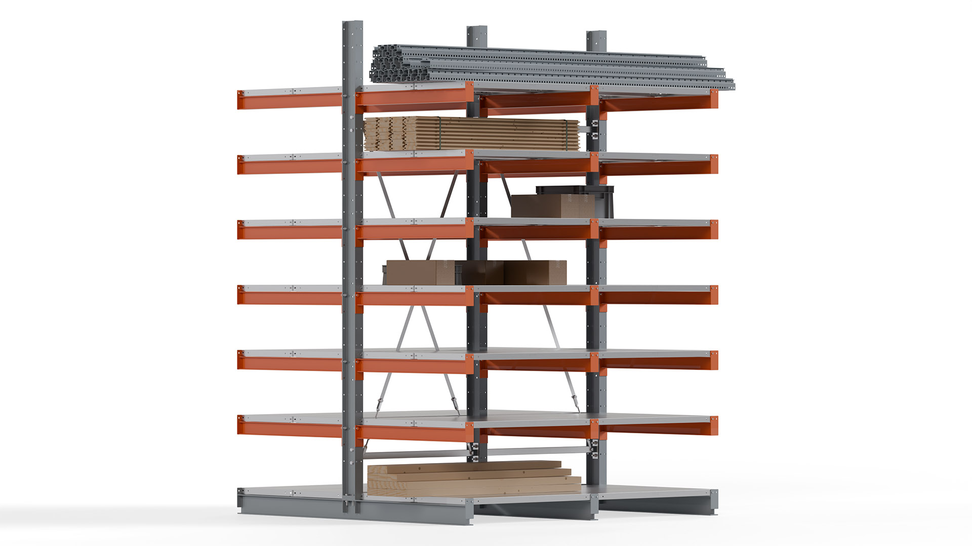Das Kragarmregal zeichnet sich durch eine beständige und widerstandsfähige Konstruktion aus. Gefertigt aus hochwertigem Stahl, werden Einzelkomponenten wie Ständerprofile, Ständerfüße, Kragarme und Ständerverbindungen zu einem stabilen Gesamtsystem verschraubt. Die sandgestrahlte Oberfläche der Stahlprofile ist in einem elektrostatischen Verfahren mit Industrielack in Silbergrau (RAL 7001) und Reinorange (RAL 2004) beschichtet.