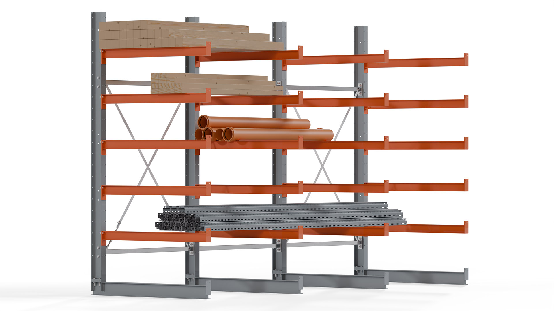 Das Kragarmregal zeichnet sich durch eine beständige und widerstandsfähige Konstruktion aus. Gefertigt aus hochwertigem Stahl, werden Einzelkomponenten wie Ständerprofile, Ständerfüße, Kragarme und Ständerverbindungen zu einem stabilen Gesamtsystem verschraubt. Die sandgestrahlte Oberfläche der Stahlprofile ist in einem elektrostatischen Verfahren mit Industrielack in Silbergrau (RAL 7001) und Reinorange (RAL 2004) beschichtet.