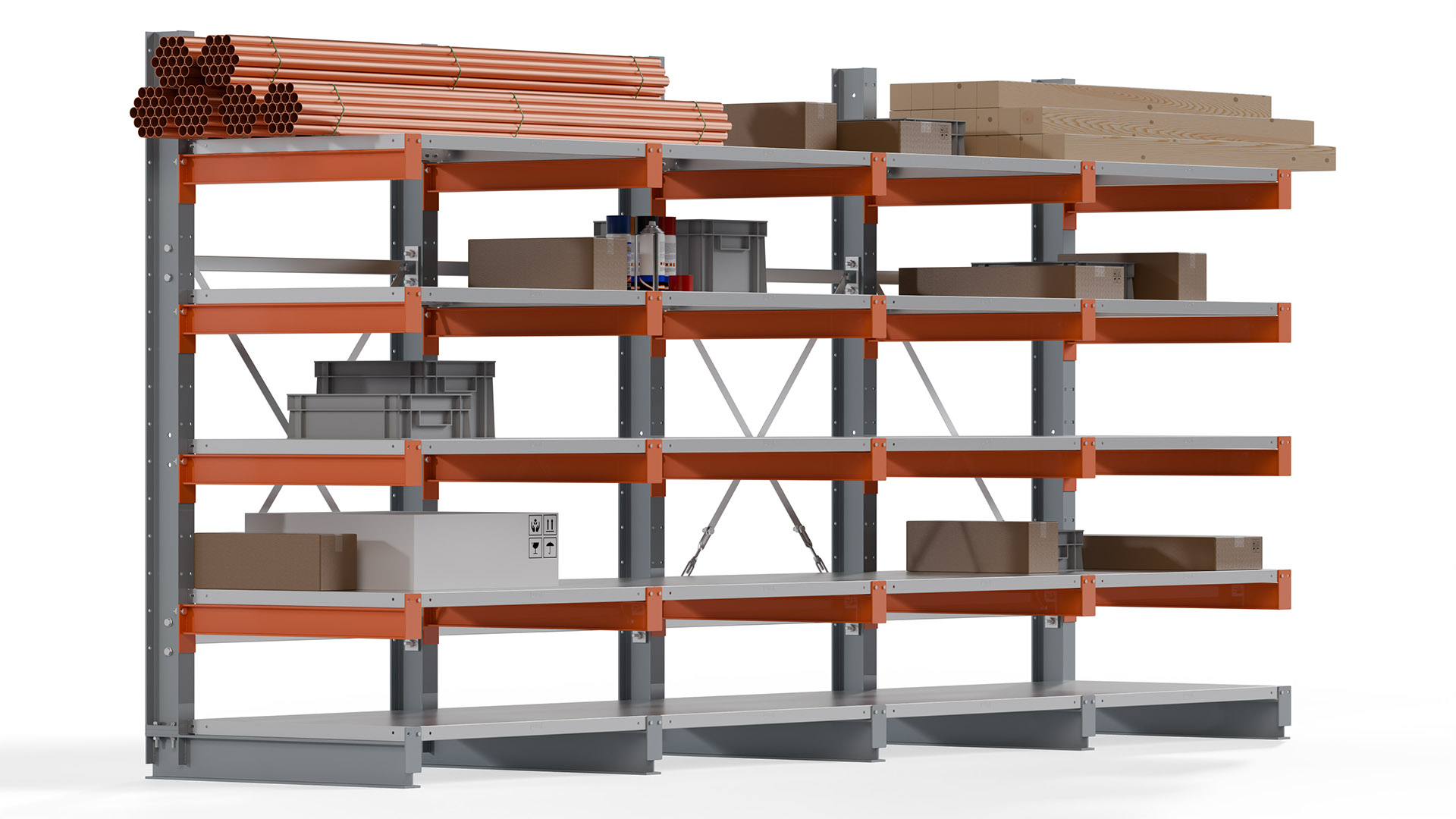 Das Kragarmregal zeichnet sich durch eine beständige und widerstandsfähige Konstruktion aus. Gefertigt aus hochwertigem Stahl, werden Einzelkomponenten wie Ständerprofile, Ständerfüße, Kragarme und Ständerverbindungen zu einem stabilen Gesamtsystem verschraubt. Die sandgestrahlte Oberfläche der Stahlprofile ist in einem elektrostatischen Verfahren mit Industrielack in Silbergrau (RAL 7001) und Reinorange (RAL 2004) beschichtet.