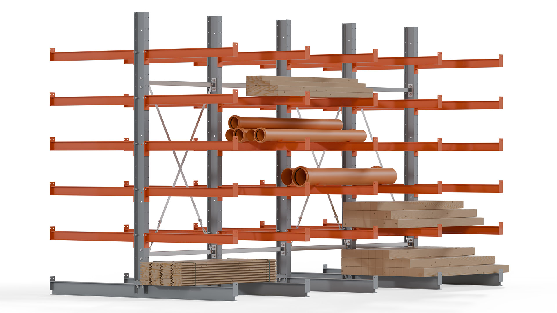 Das Kragarmregal zeichnet sich durch eine beständige und widerstandsfähige Konstruktion aus. Gefertigt aus hochwertigem Stahl, werden Einzelkomponenten wie Ständerprofile, Ständerfüße, Kragarme und Ständerverbindungen zu einem stabilen Gesamtsystem verschraubt. Die sandgestrahlte Oberfläche der Stahlprofile ist in einem elektrostatischen Verfahren mit Industrielack in Silbergrau (RAL 7001) und Reinorange (RAL 2004) beschichtet.