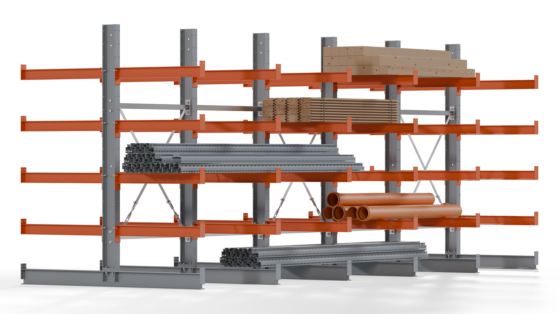 Das Kragarmregal zeichnet sich durch eine beständige und widerstandsfähige Konstruktion aus. Gefertigt aus hochwertigem Stahl, werden Einzelkomponenten wie Ständerprofile, Ständerfüße, Kragarme und Ständerverbindungen zu einem stabilen Gesamtsystem verschraubt. Die sandgestrahlte Oberfläche der Stahlprofile ist in einem elektrostatischen Verfahren mit Industrielack in Silbergrau (RAL 7001) und Reinorange (RAL 2004) beschichtet.