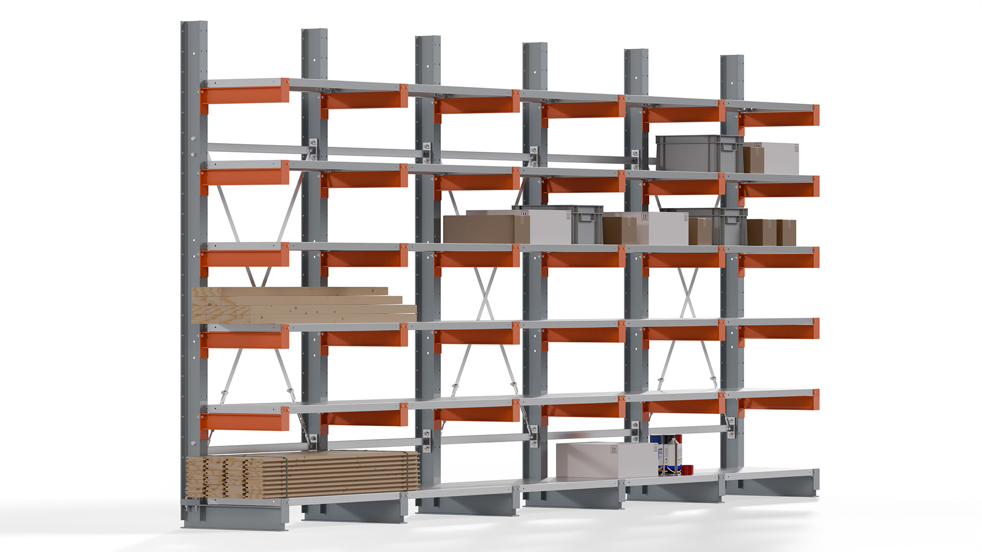 Das Kragarmregal zeichnet sich durch eine beständige und widerstandsfähige Konstruktion aus. Gefertigt aus hochwertigem Stahl, werden Einzelkomponenten wie Ständerprofile, Ständerfüße, Kragarme und Ständerverbindungen zu einem stabilen Gesamtsystem verschraubt. Die sandgestrahlte Oberfläche der Stahlprofile ist in einem elektrostatischen Verfahren mit Industrielack in Silbergrau (RAL 7001) und Reinorange (RAL 2004) beschichtet.