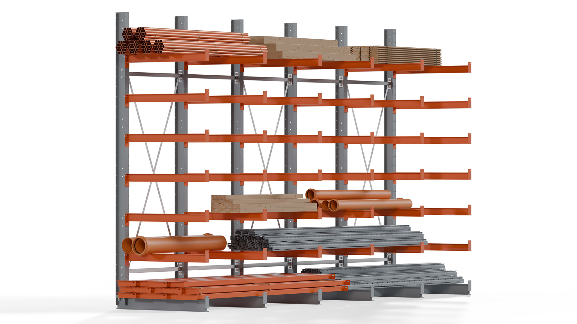 Das Kragarmregal zeichnet sich durch eine beständige und widerstandsfähige Konstruktion aus. Gefertigt aus hochwertigem Stahl, werden Einzelkomponenten wie Ständerprofile, Ständerfüße, Kragarme und Ständerverbindungen zu einem stabilen Gesamtsystem verschraubt. Die sandgestrahlte Oberfläche der Stahlprofile ist in einem elektrostatischen Verfahren mit Industrielack in Silbergrau (RAL 7001) und Reinorange (RAL 2004) beschichtet.