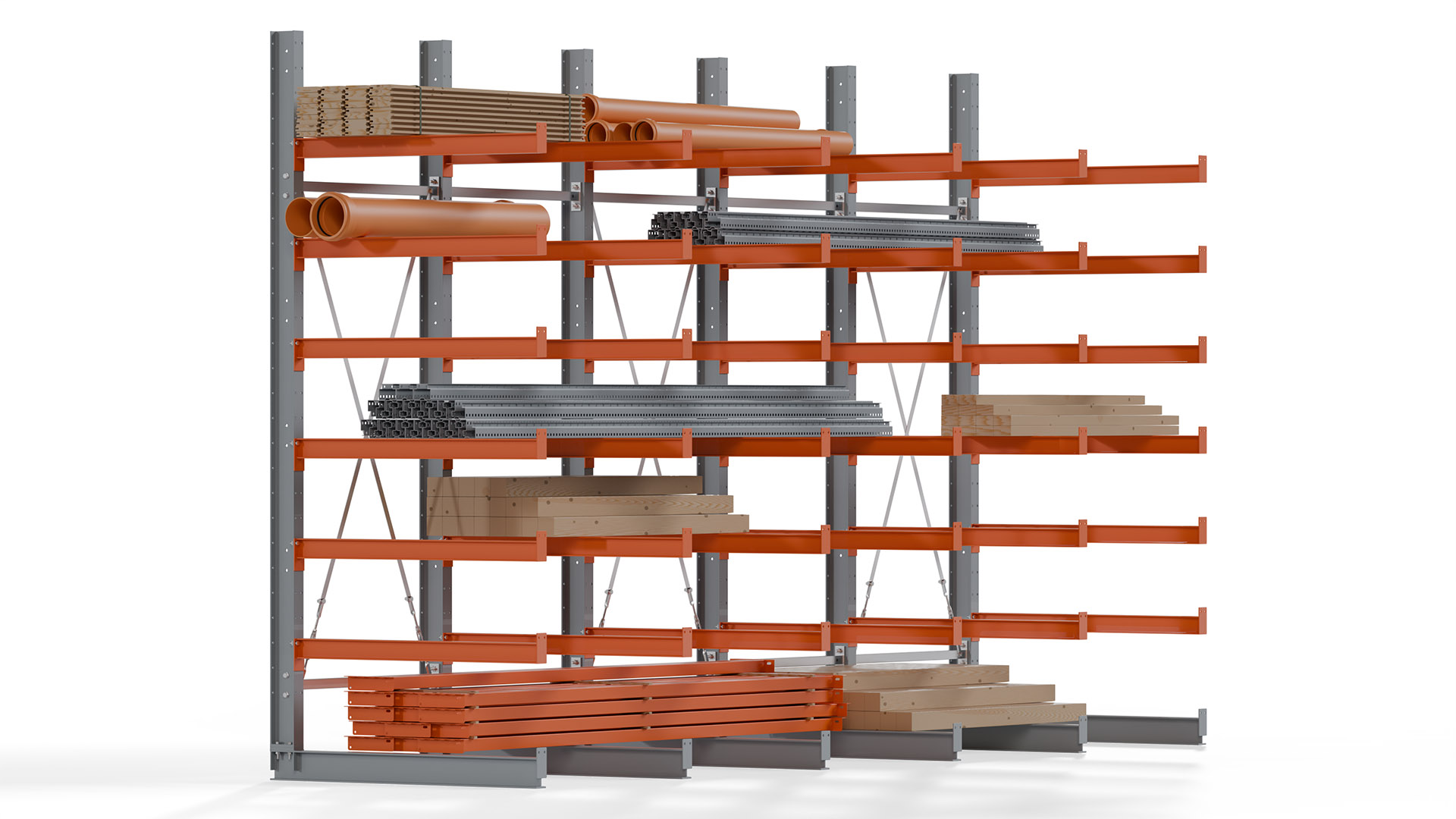 Das Kragarmregal zeichnet sich durch eine beständige und widerstandsfähige Konstruktion aus. Gefertigt aus hochwertigem Stahl, werden Einzelkomponenten wie Ständerprofile, Ständerfüße, Kragarme und Ständerverbindungen zu einem stabilen Gesamtsystem verschraubt. Die sandgestrahlte Oberfläche der Stahlprofile ist in einem elektrostatischen Verfahren mit Industrielack in Silbergrau (RAL 7001) und Reinorange (RAL 2004) beschichtet.