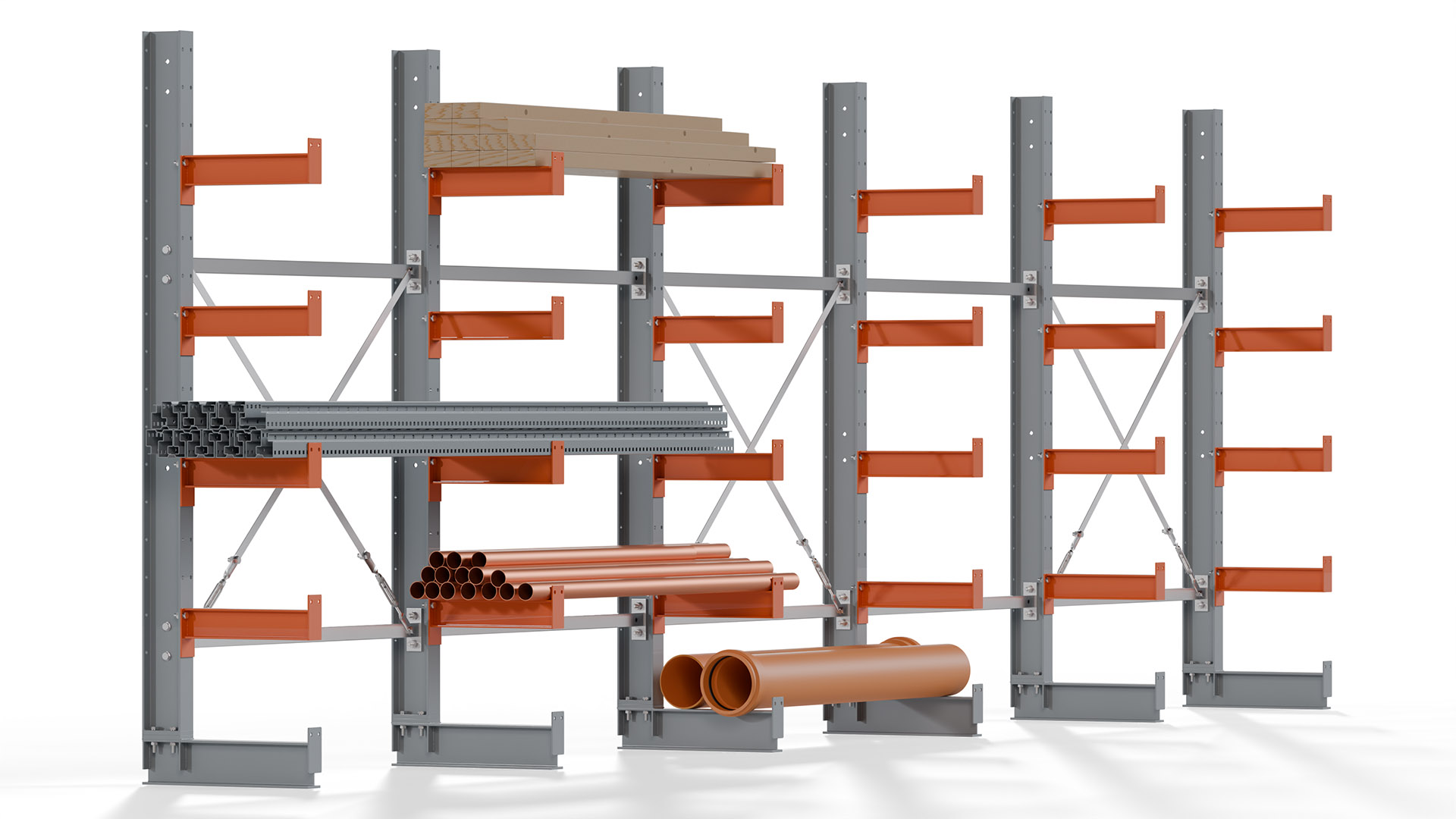 Das Kragarmregal zeichnet sich durch eine beständige und widerstandsfähige Konstruktion aus. Gefertigt aus hochwertigem Stahl, werden Einzelkomponenten wie Ständerprofile, Ständerfüße, Kragarme und Ständerverbindungen zu einem stabilen Gesamtsystem verschraubt. Die sandgestrahlte Oberfläche der Stahlprofile ist in einem elektrostatischen Verfahren mit Industrielack in Silbergrau (RAL 7001) und Reinorange (RAL 2004) beschichtet.