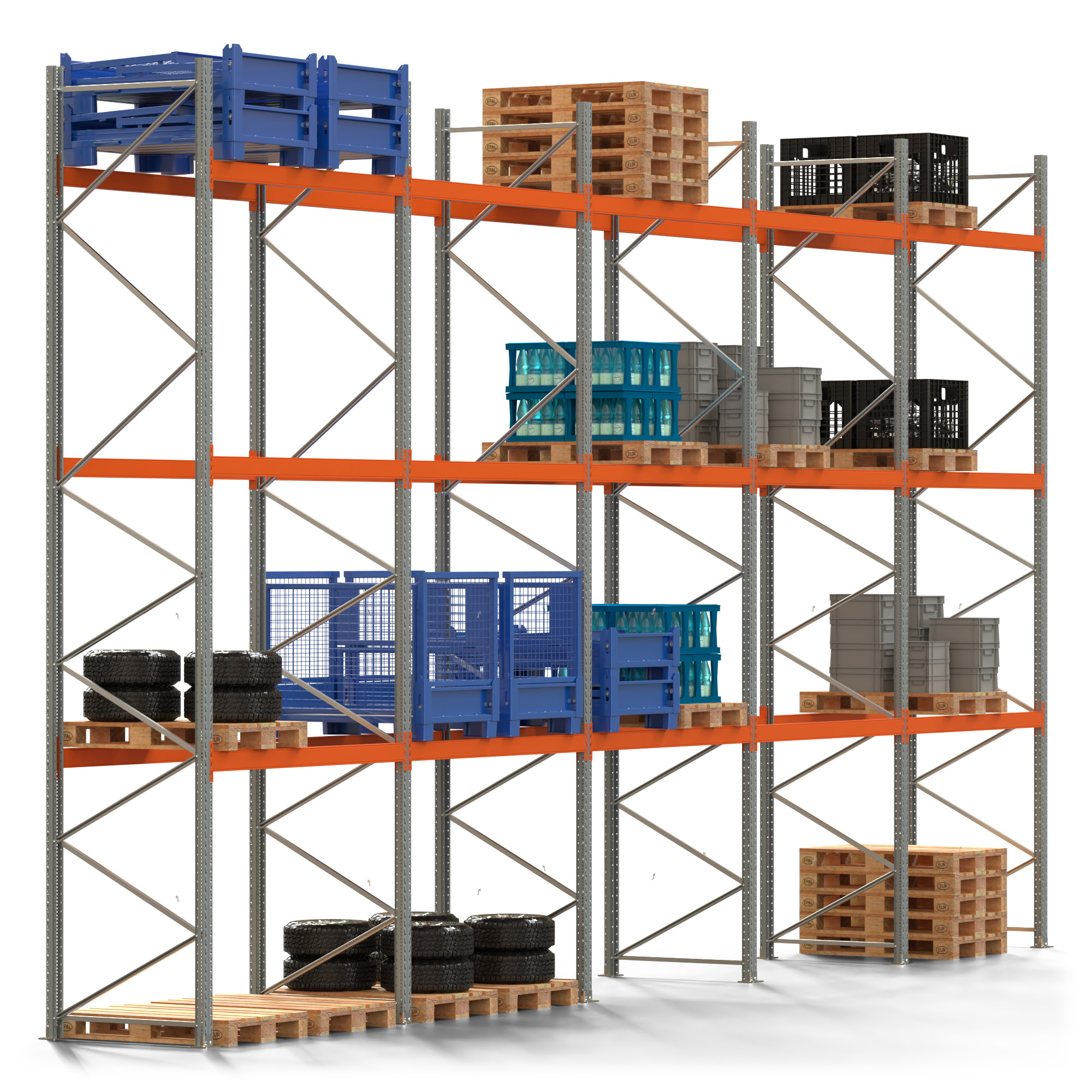 Palettenregal ARTUS - Breite 1001 cm - Höhe 550 cm - Tiefe 110 cm - 3 Träger-Ebenen - Fachlast 2000 kg - 40 Palettenstellplätze