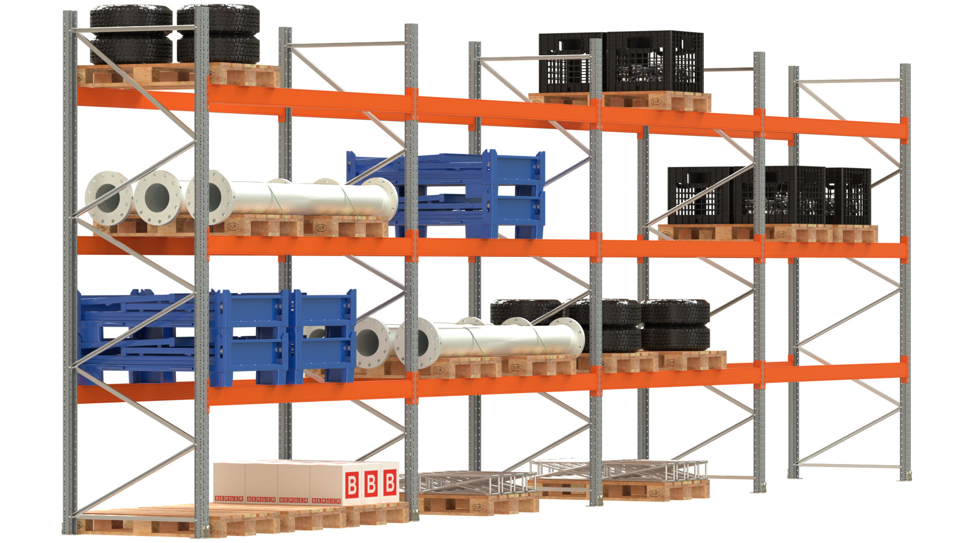 Palettenregal ARTUS - Breite 1122,5 cm - Höhe 350 cm - Tiefe 110 cm - 3 Träger-Ebenen - Fachlast 3000 kg - 48 Palettenstellplätze