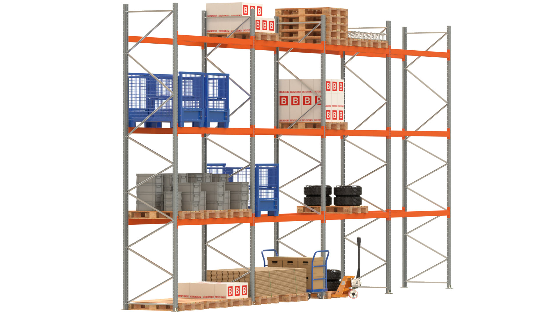 Palettenregal ARTUS - Breite 1122,5 cm - Höhe 550 cm - Tiefe 110 cm - 3 Träger-Ebenen - Fachlast 2000 kg - 48 Palettenstellplätze