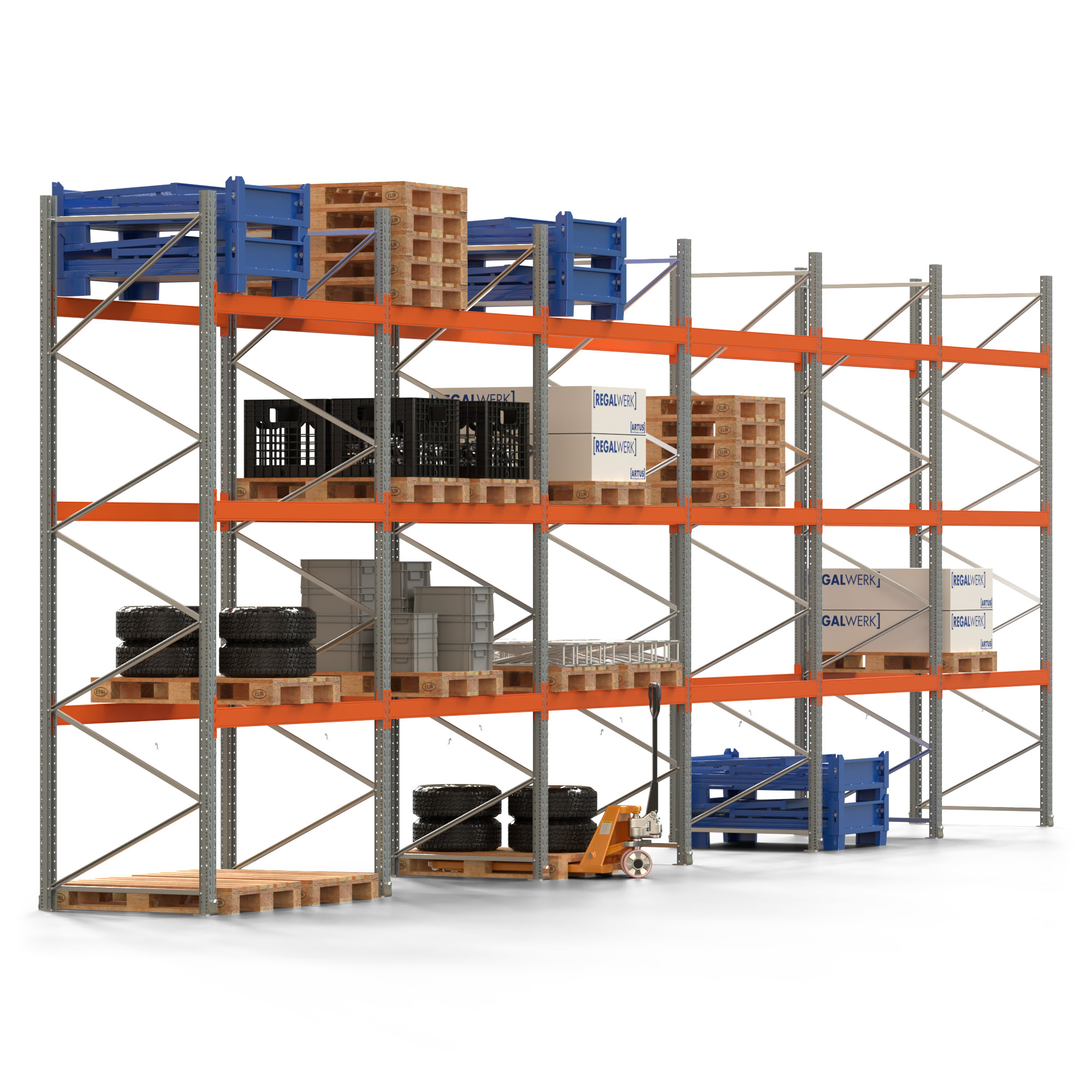Palettenregal ARTUS - Breite 1199,5 cm - Höhe 400 cm - Tiefe 110 cm - 3 Träger-Ebenen - Fachlast 2000 kg - 48 Palettenstellplätze