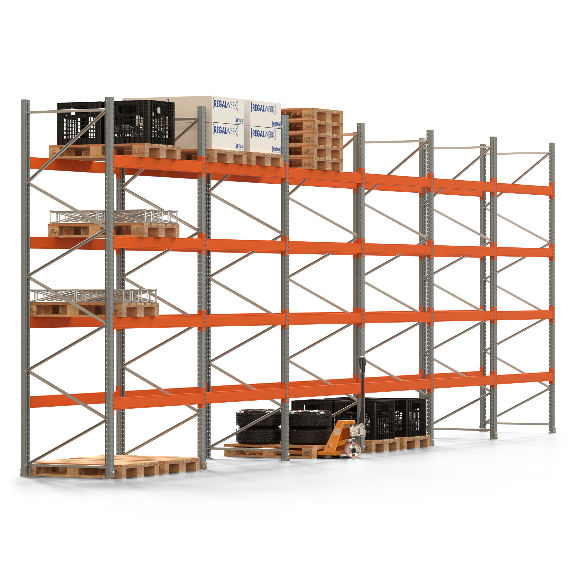 Palettenregal ARTUS - Breite 1199,5 cm - Höhe 400 cm - Tiefe 110 cm - 4 Träger-Ebenen - Fachlast 2600 kg - 60 Palettenstellplätze