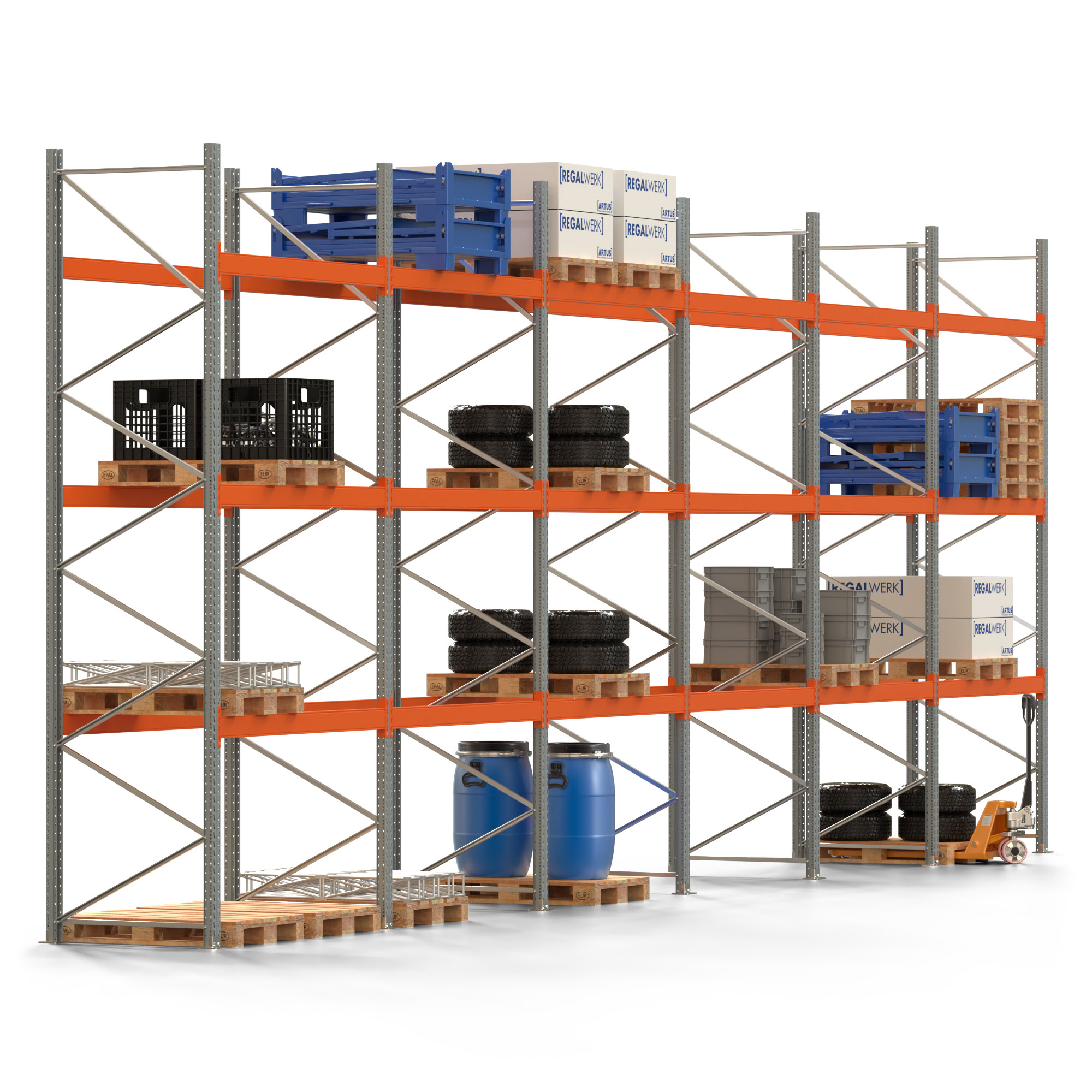 Palettenregal ARTUS - Breite 1199,5 cm - Höhe 450 cm - Tiefe 110 cm - 3 Träger-Ebenen - Fachlast 3000 kg - 48 Palettenstellplätze