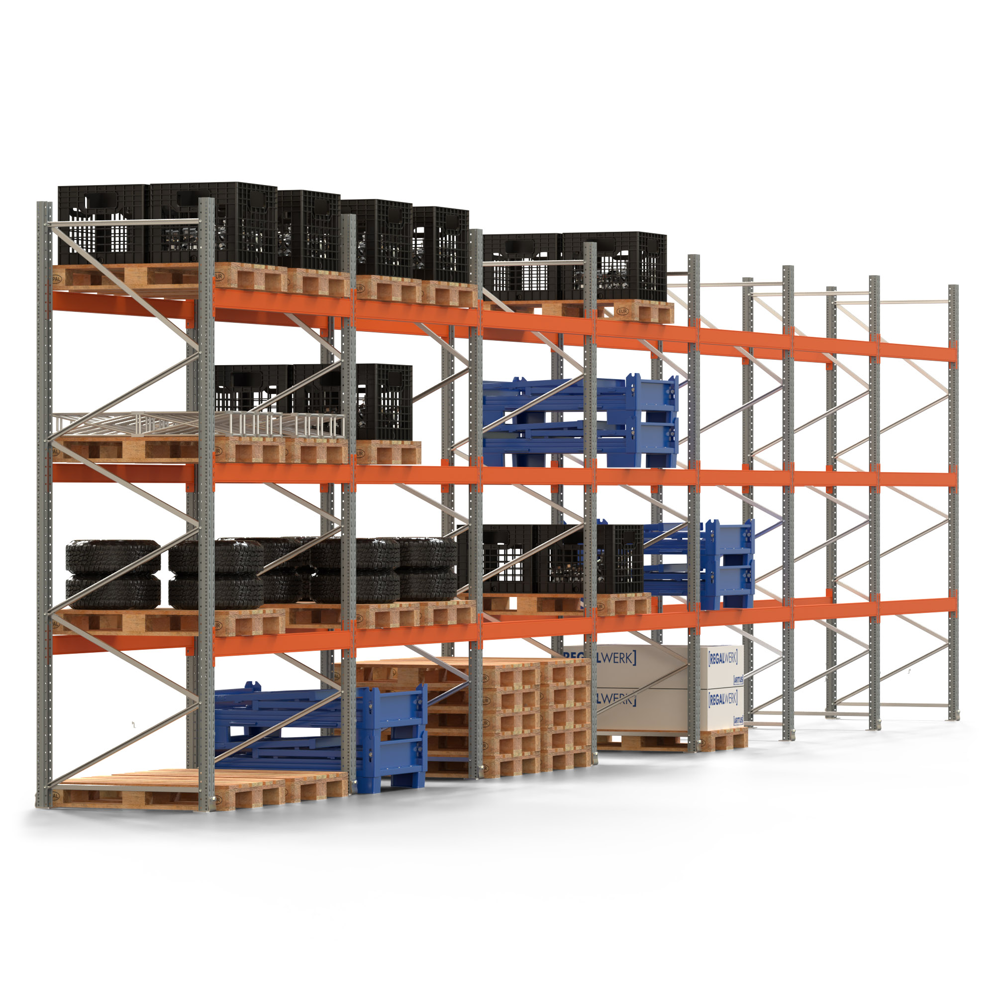 Palettenregal ARTUS - Breite 1398 cm - Höhe 350 cm - Tiefe 110 cm - 3 Träger-Ebenen - Fachlast 2000 kg - 56 Palettenstellplätze