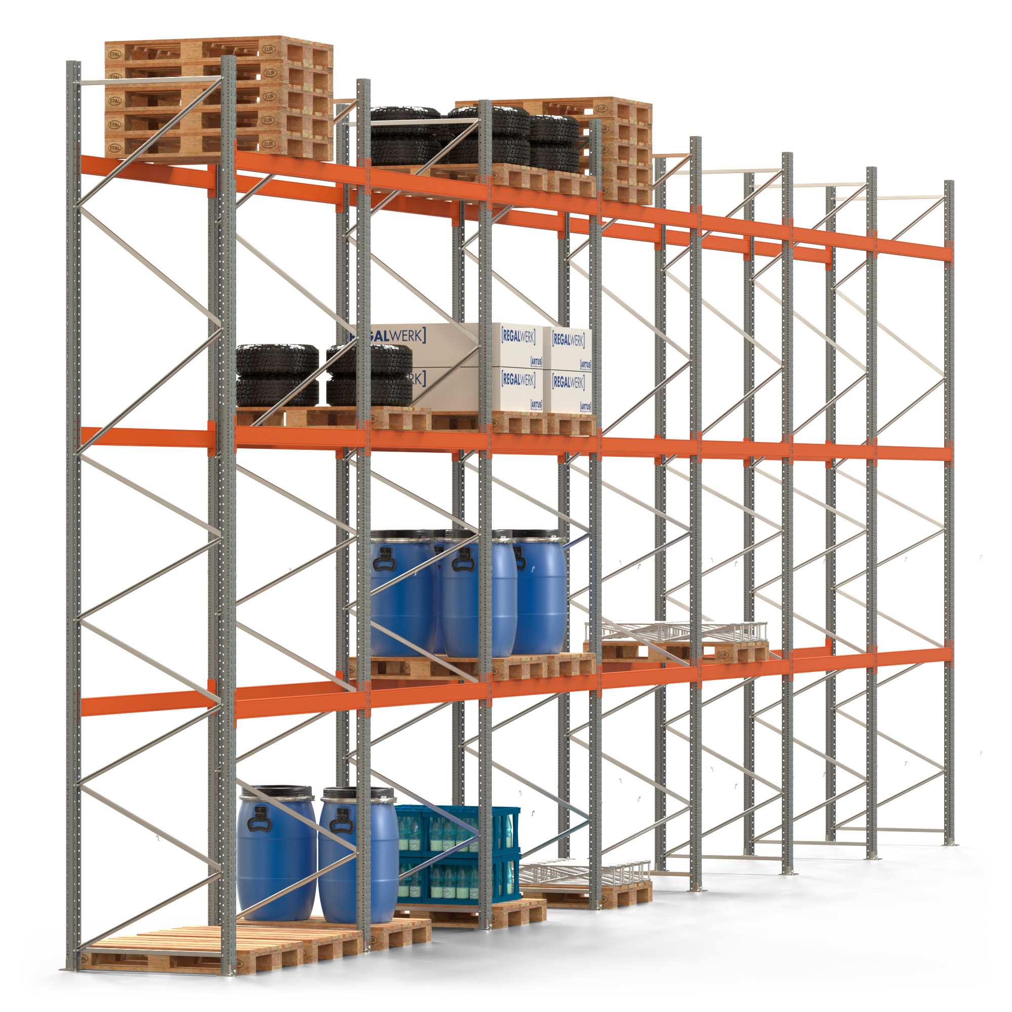 Palettenregal ARTUS - Breite 1398 cm - Höhe 550 cm - Tiefe 110 cm - 3 Träger-Ebenen - Fachlast 2000 kg - 56 Palettenstellplätze