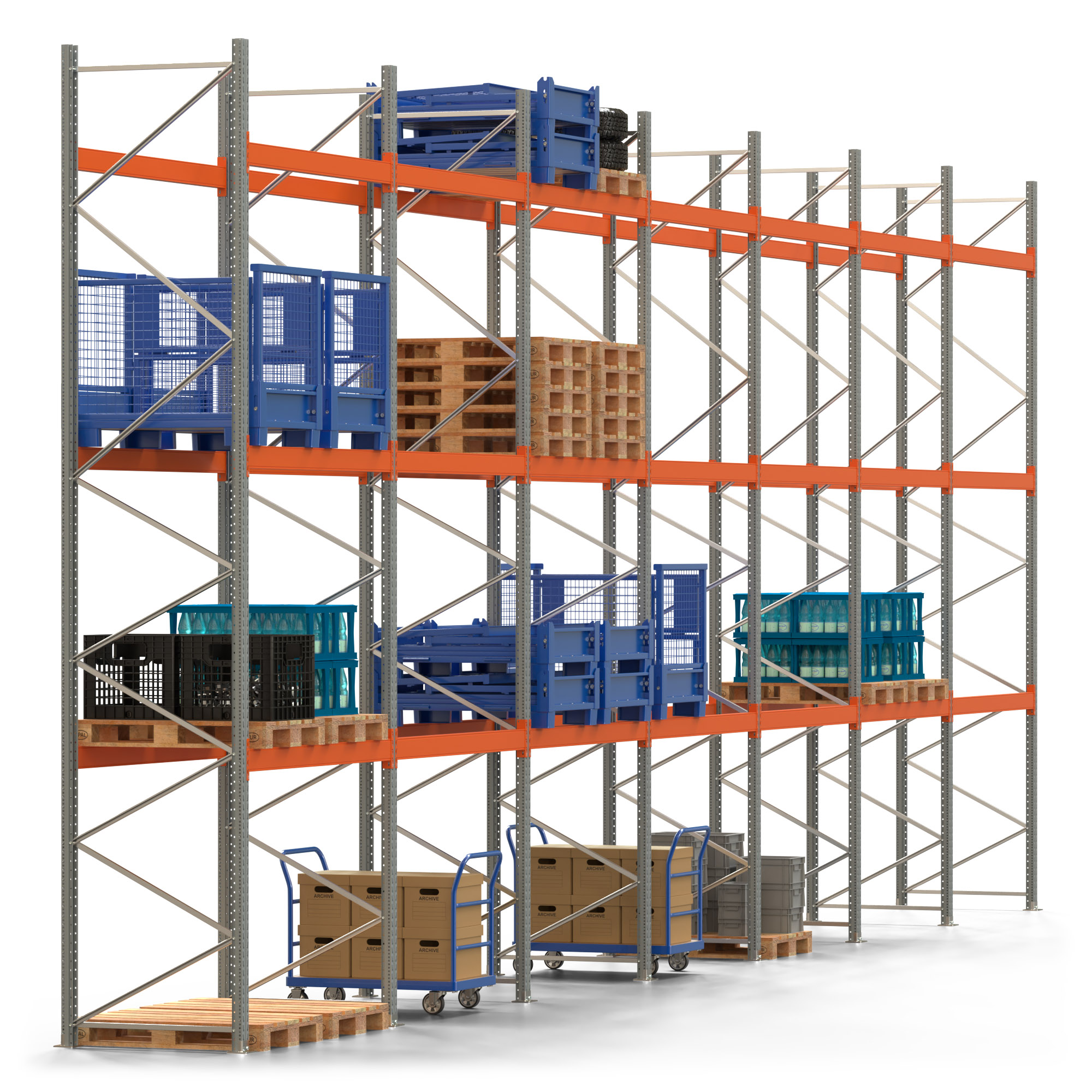 Palettenregal ARTUS - Breite 1398 cm - Höhe 550 cm - Tiefe 110 cm - 3 Träger-Ebenen - Fachlast 3000 kg - 56 Palettenstellplätze