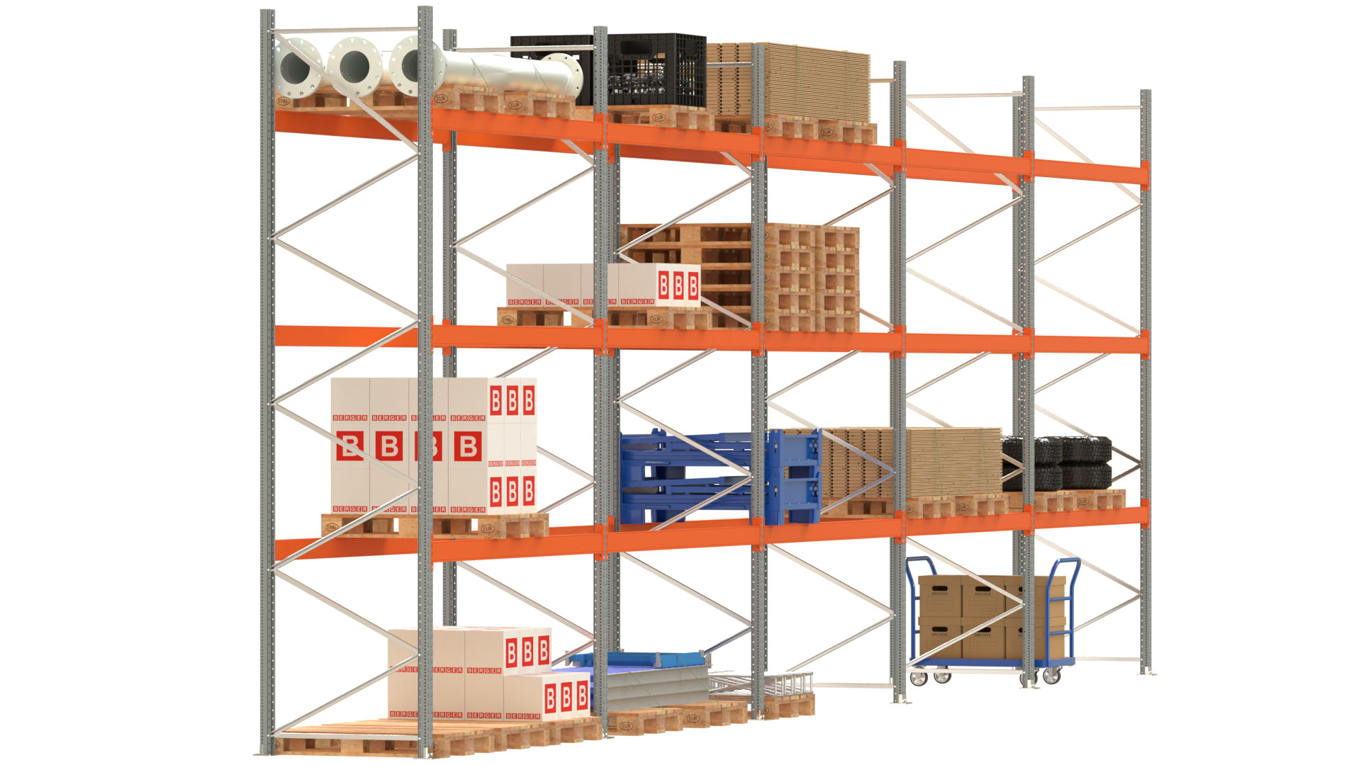 Palettenregal ARTUS - Breite 1401 cm - Höhe 450 cm - Tiefe 110 cm - 3 Träger-Ebenen - Fachlast 3000 kg - 60 Palettenstellplätze
