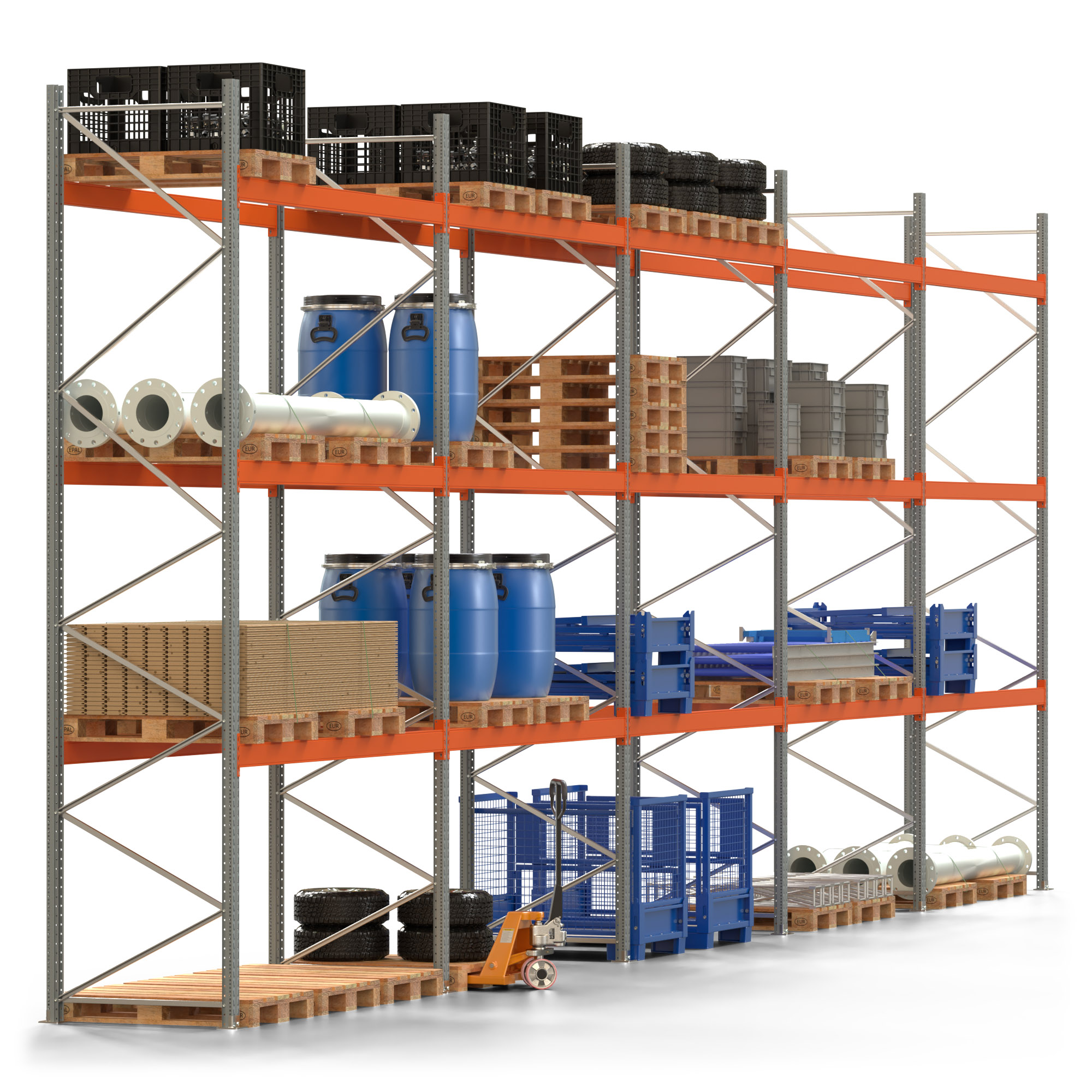 Palettenregal ARTUS - Breite 1401 cm - Höhe 500 cm - Tiefe 110 cm - 3 Träger-Ebenen - Fachlast 3000 kg - 60 Palettenstellplätze