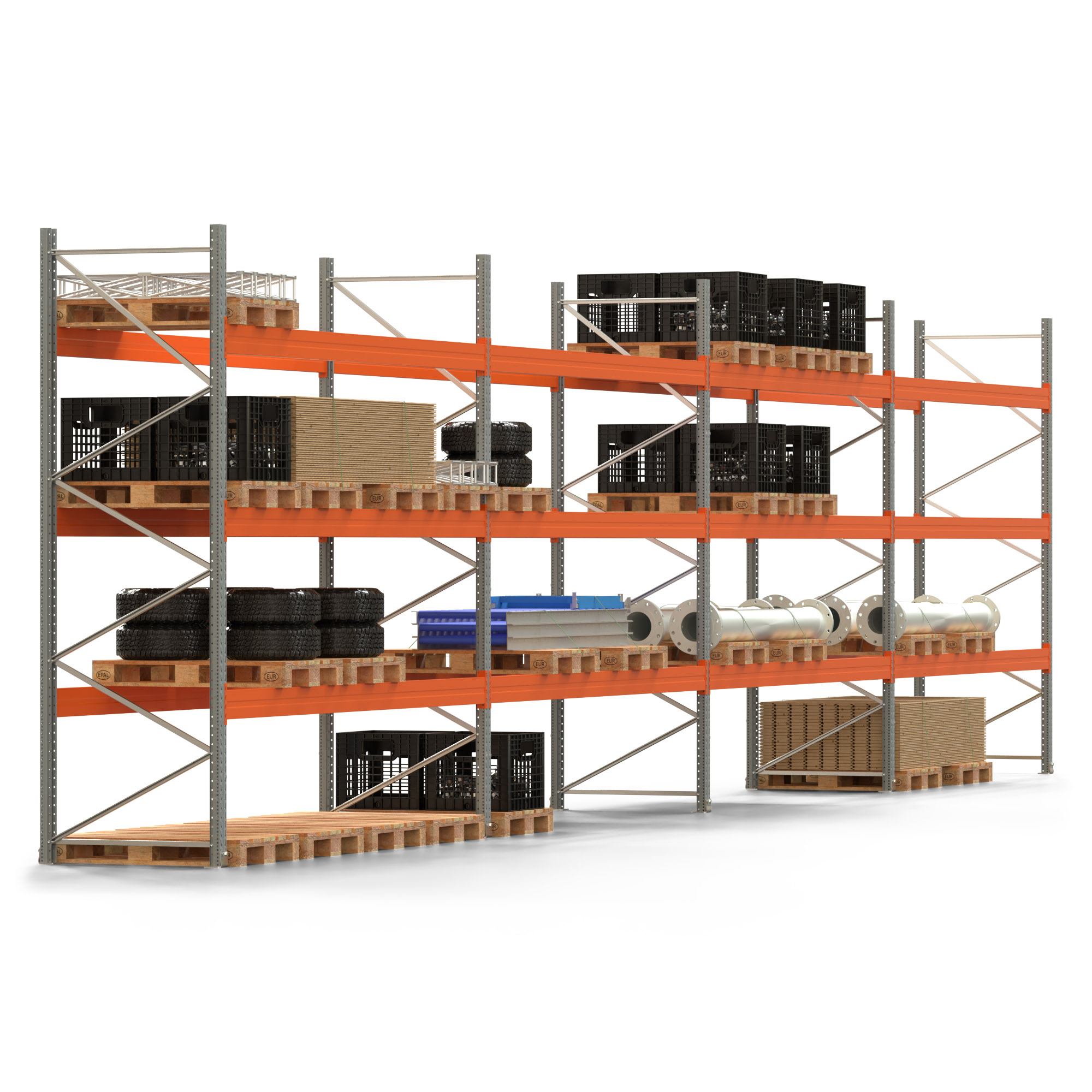 Palettenregal ARTUS - Breite 1482,5 cm - Höhe 350 cm - Tiefe 110 cm - 3 Träger-Ebenen - Fachlast 3000 kg - 64 Palettenstellplätze