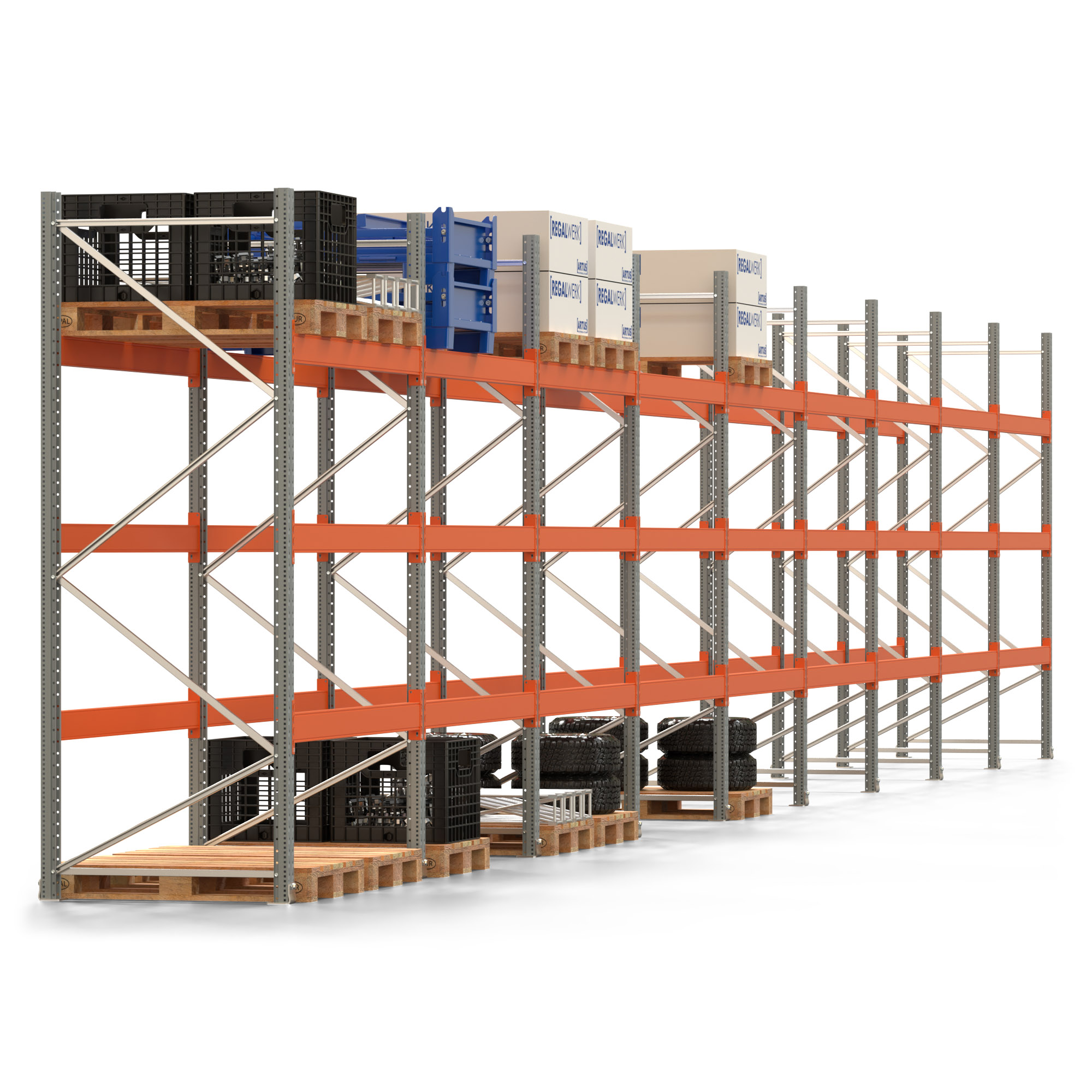 Palettenregal ARTUS - Breite 1795 cm - Höhe 300 cm - Tiefe 110 cm - 3 Träger-Ebenen - Fachlast 3000 kg - 72 Palettenstellplätze