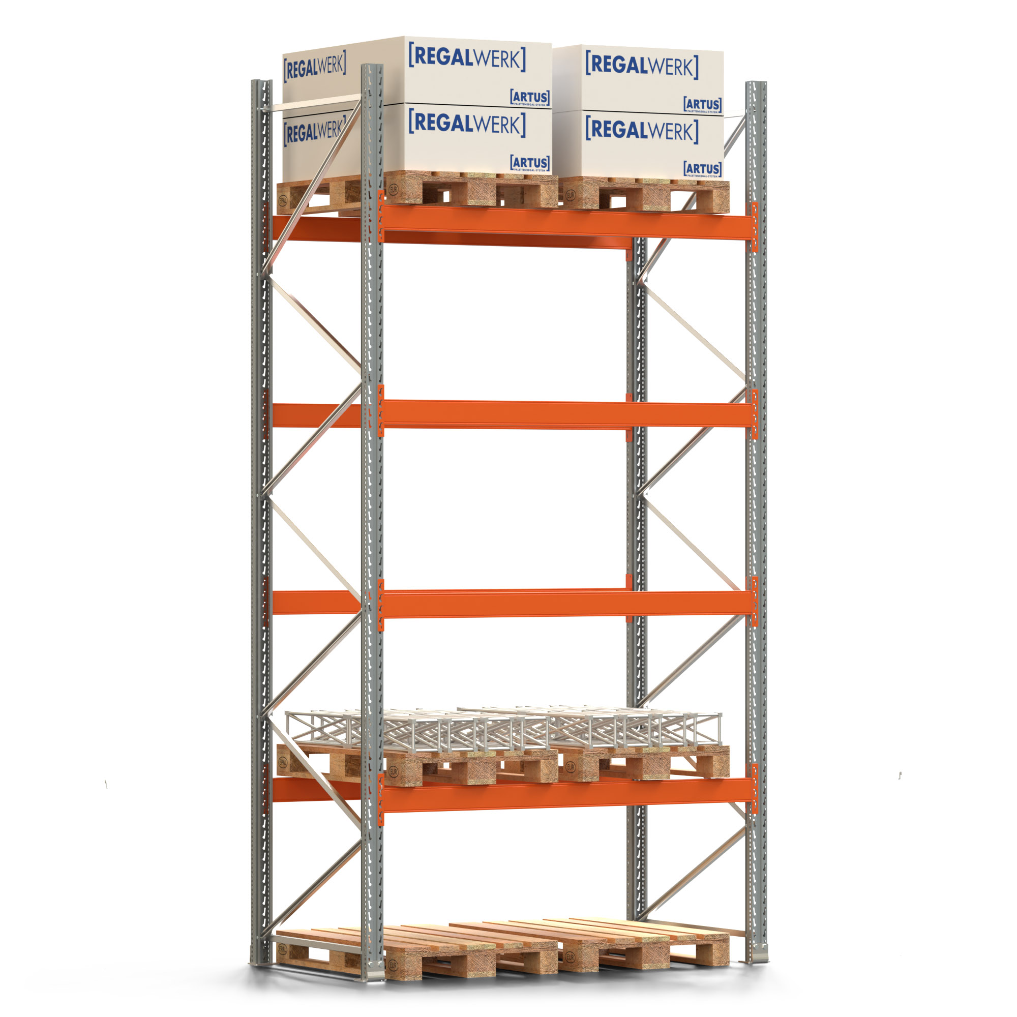 Palettenregal ARTUS - Breite 207 cm - Höhe 400 cm - Tiefe 110 cm - 4 Träger-Ebenen - Fachlast 2000 kg - 10 Palettenstellplätze