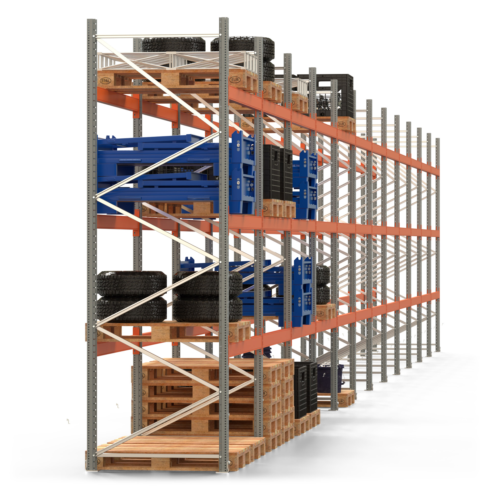 Das Palettenregal-System ARTUS bietet die ideale Lösung für eine professionelle Lagerung von Paletten und schweren Lasten. Dieses qualitativ hochwertige verarbeitete Palettenregal hält hohe Belastungen von bis zu 6000 kg pro Feld und einer max. Belastung von 2000 kg pro Traversenebene problemlos stand. In dieser Ausführung mit einer Regaltiefe von 1100 mm und der Einlagerung von EURO-Paletten (1.200x800mm) in Tiefenrichtung können Sie bis zu 96 Paletten lagern.