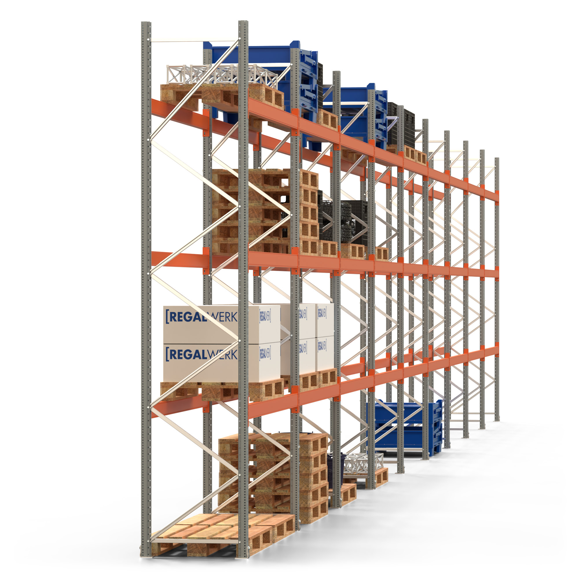 Palettenregal ARTUS - Breite 2515 cm - Höhe 400 cm - Tiefe 80 cm - 3 Träger-Ebenen - Fachlast 2000 kg - 72 Palettenstellplätze