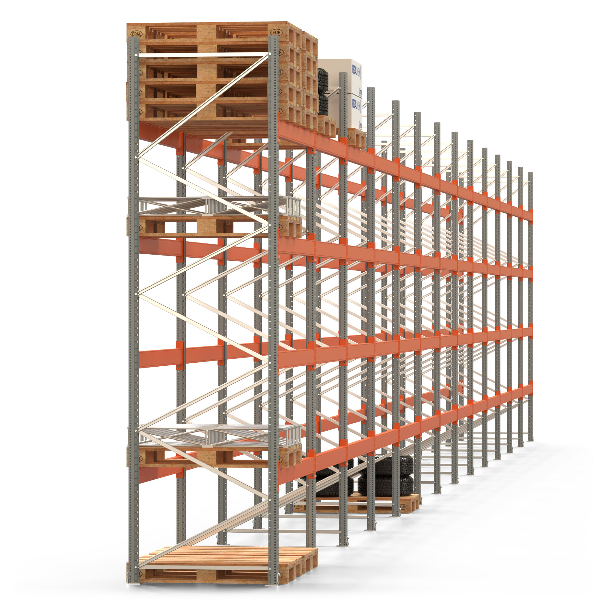 Palettenregal ARTUS - Breite 2589 cm - Höhe 400 cm - Tiefe 110 cm - 4 Träger-Ebenen - Fachlast 2600 kg - 130 Palettenstellplätze