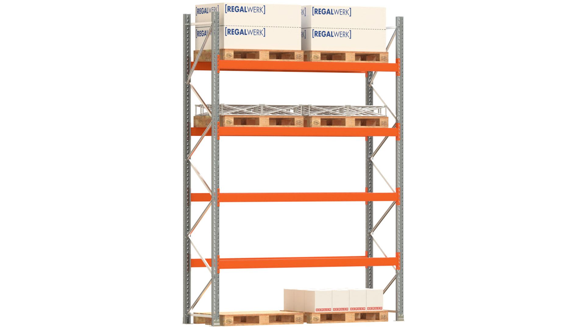 Palettenregal ARTUS - Breite 287 cm - Höhe 400 cm - Tiefe 80 cm - 4 Träger-Ebenen - Fachlast 2320 kg - 10 Palettenstellplätze