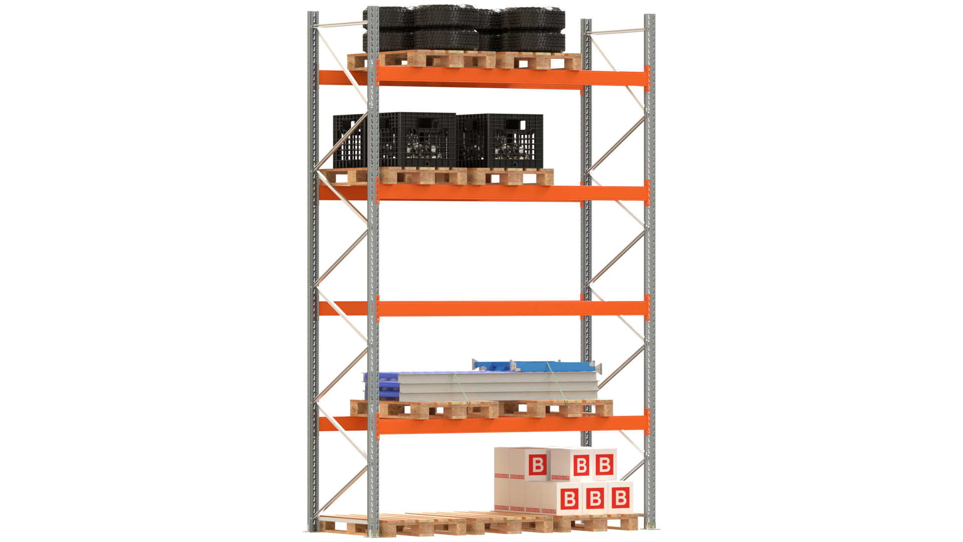 Palettenregal ARTUS - Breite 287 cm - Höhe 450 cm - Tiefe 110 cm - 4 Träger-Ebenen - Fachlast 3000 kg - 15 Palettenstellplätze