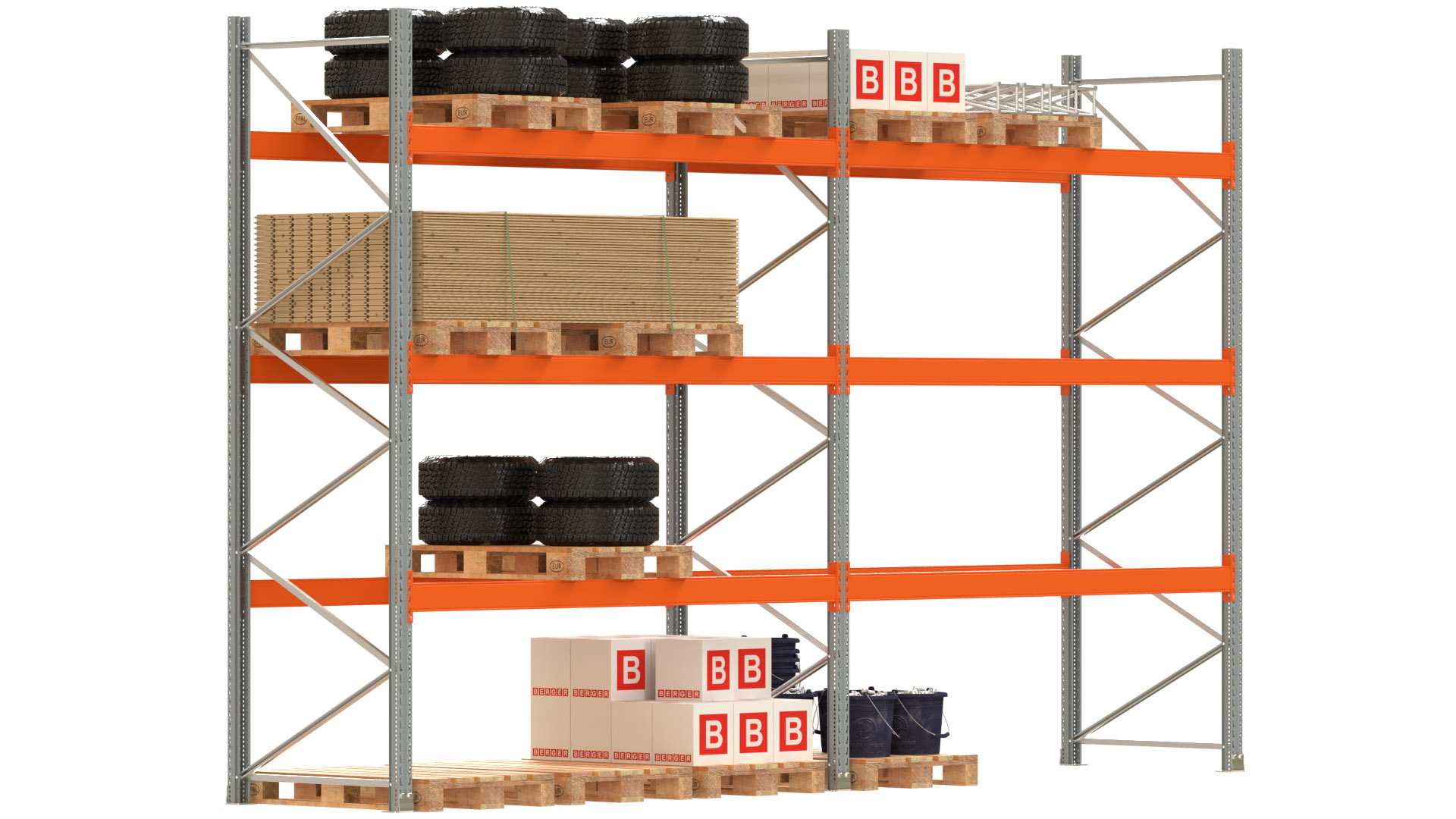 Palettenregal ARTUS - Breite 565,5 cm - Höhe 350 cm - Tiefe 110 cm - 3 Träger-Ebenen - Fachlast 3000 kg - 24 Palettenstellplätze