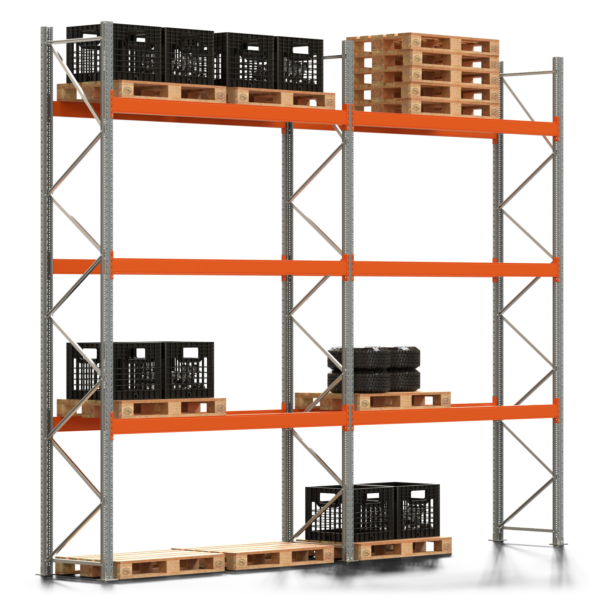 Palettenregal ARTUS - Breite 565,5 cm - Höhe 450 cm - Tiefe 80 cm - 3 Träger-Ebenen - Fachlast 2910 kg - 16 Palettenstellplätze