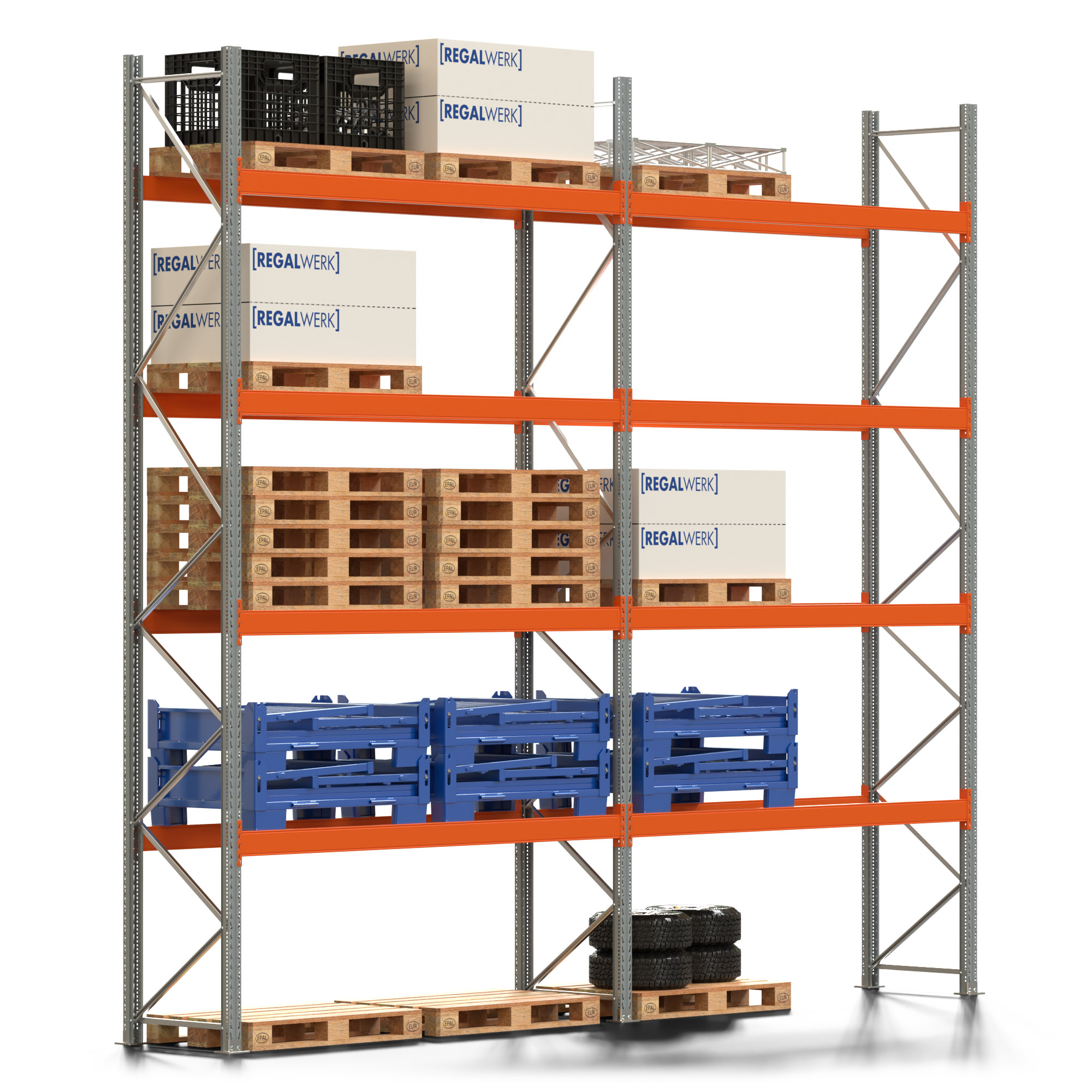 Palettenregal ARTUS - Breite 565,5 cm - Höhe 500 cm - Tiefe 80 cm - 4 Träger-Ebenen - Fachlast 2250 kg - 20 Palettenstellplätze