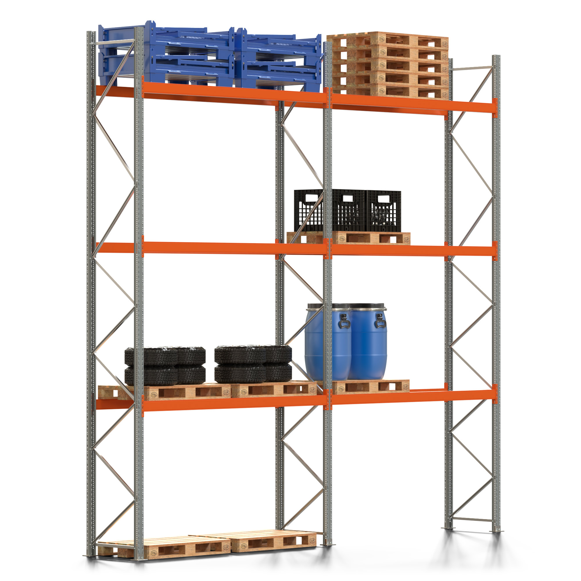 Palettenregal ARTUS - Breite 565,5 cm - Höhe 550 cm - Tiefe 80 cm - 3 Träger-Ebenen - Fachlast 2000 kg - 16 Palettenstellplätze