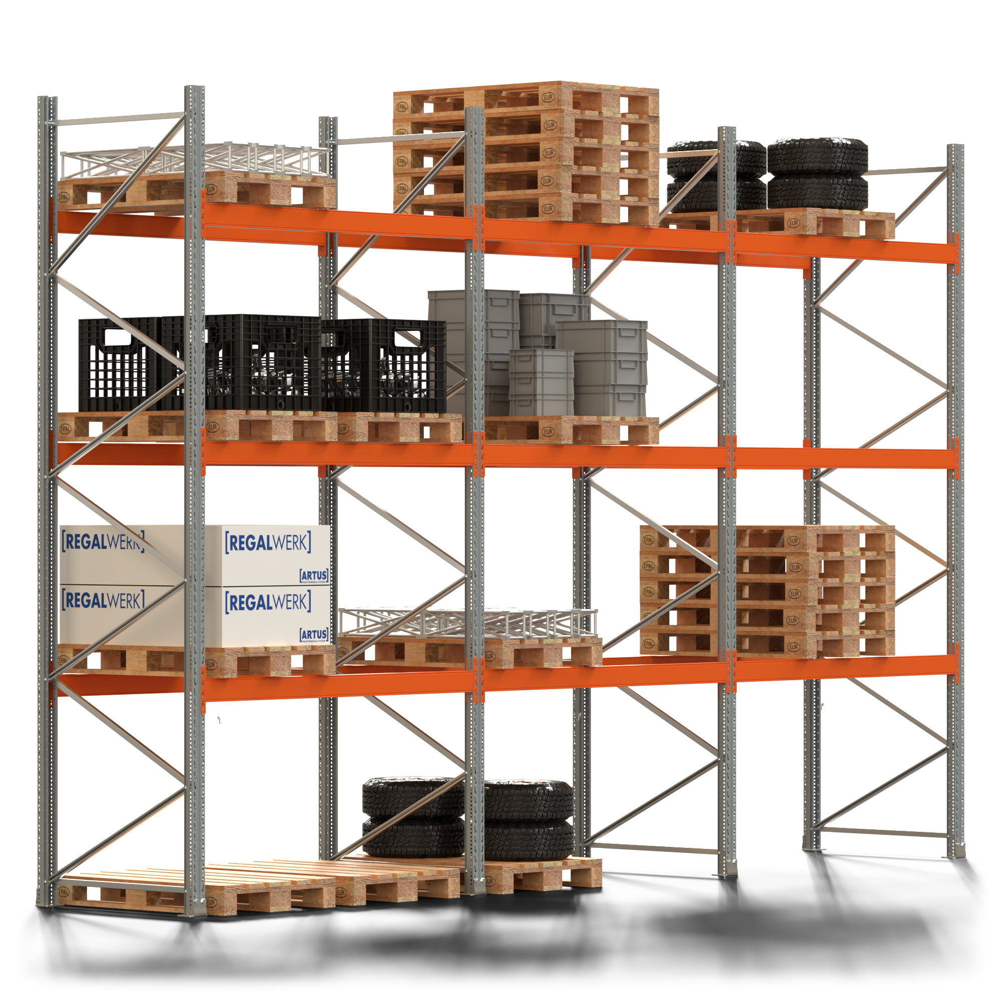 Palettenregal ARTUS - Breite 604 cm - Höhe 400 cm - Tiefe 110 cm - 3 Träger-Ebenen - Fachlast 2000 kg - 24 Palettenstellplätze