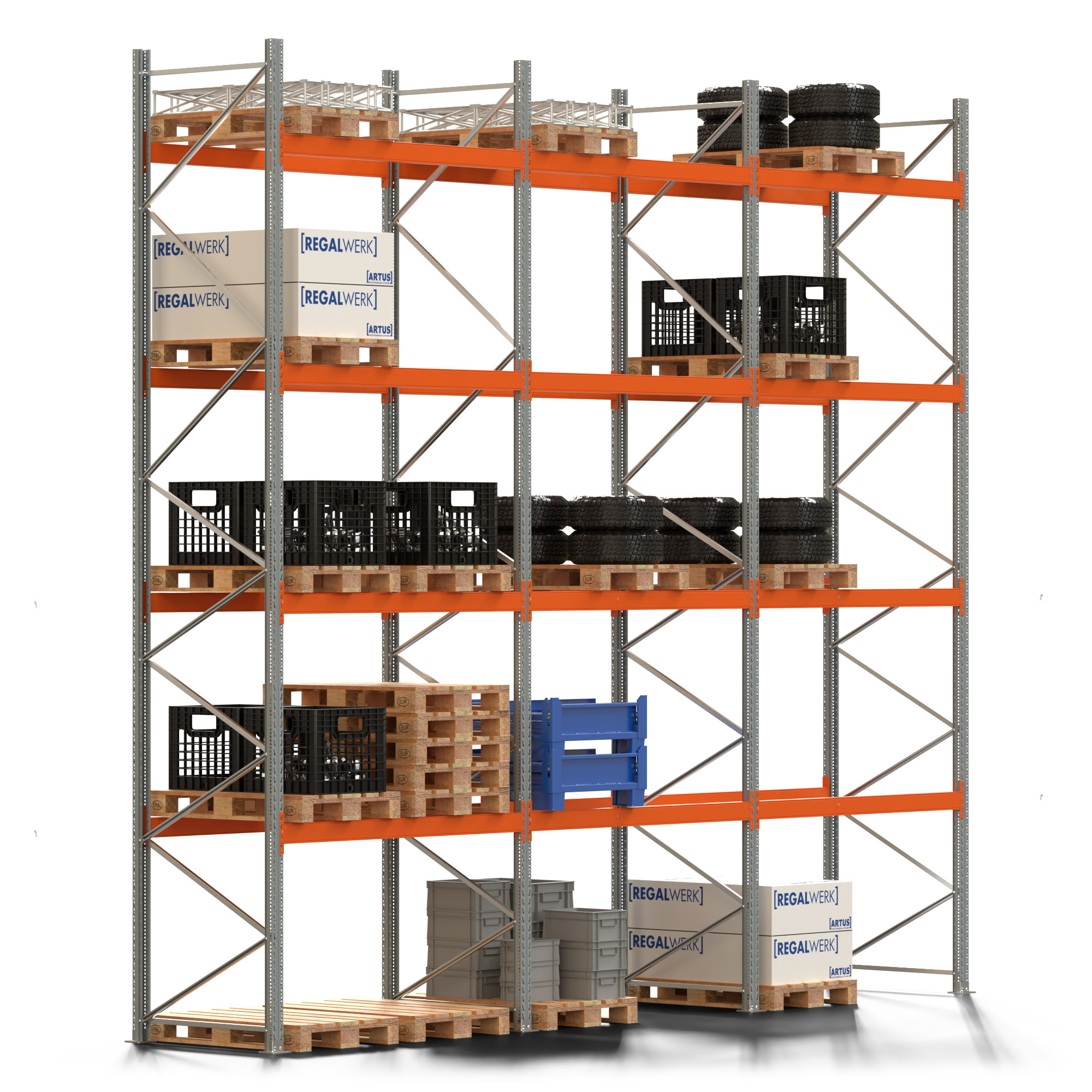 Palettenregal ARTUS - Breite 604 cm - Höhe 550 cm - Tiefe 110 cm - 4 Träger-Ebenen - Fachlast 2000 kg - 30 Palettenstellplätze