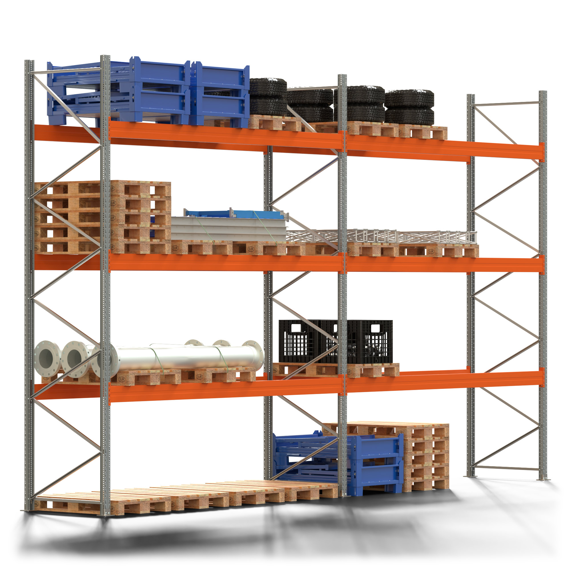 Palettenregal ARTUS - Breite 745,5 cm - Höhe 450 cm - Tiefe 110 cm - 3 Träger-Ebenen - Fachlast 3000 kg - 32 Palettenstellplätze