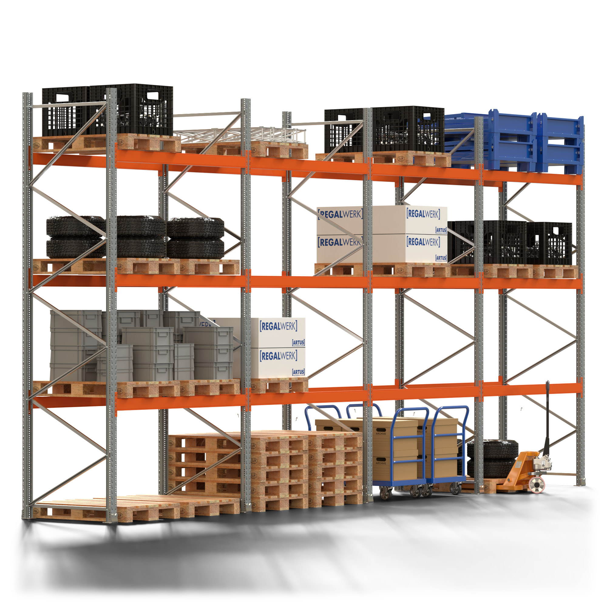 Palettenregal ARTUS - Breite 802,5 cm - Höhe 400 cm - Tiefe 110 cm - 3 Träger-Ebenen - Fachlast 2000 kg - 32 Palettenstellplätze