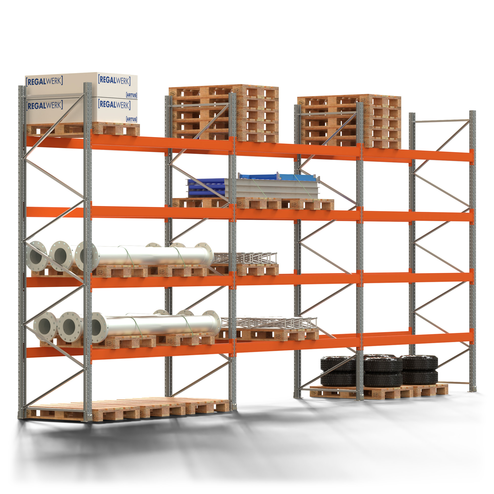 Palettenregal ARTUS - Breite 844 cm - Höhe 400 cm - Tiefe 110 cm - 4 Träger-Ebenen - Fachlast 2325 kg - 45 Palettenstellplätze