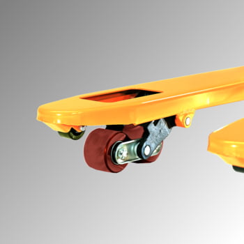 Der Handgabelhubwagen verfügt über eine stabile Stahlrohrdeichsel mit Gegenlager für den Schubbetrieb, der Griff ist Gummi ummantelt, die Tandemlastrollen erhöhen den Fahrkomfort bei unebenen Böden.