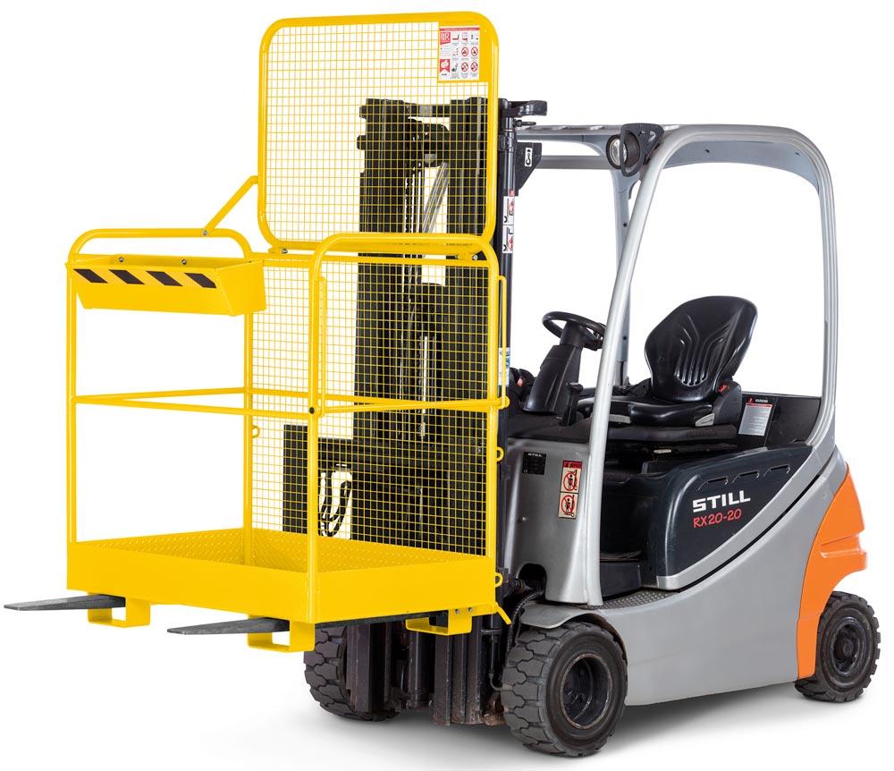 · TÜV geprüfte Sicherheit, entsprechend der DGUV (Deutsche gesetzliche Unfallversicherung) · Stabile Stahlkonstruktion mit rundum Absturzsicherung aus Rohr gemäß UVV · Arbeitskörbe mit TÜV-Zulassung für 2 Personen · Arbeitsplattform aus rutschsicherer Tränenblechkonstruktion mit Abrollschutz · Steckbolzensicherung verhindert das Abrutschen von den Gabelzinken · Pulverbeschichtet · Verzinkte Ausführung auf Anfrage lieferbar
