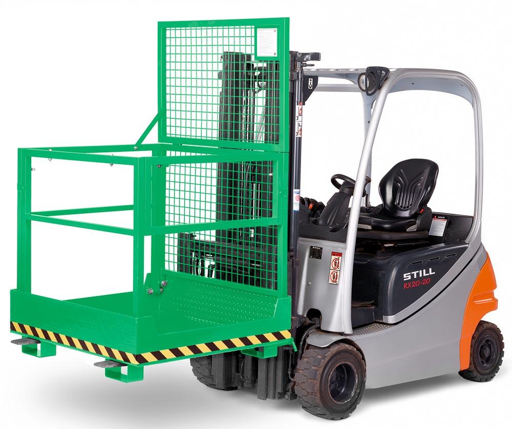 · TÜV geprüfte Sicherheit, entsprechend der DGUV (Deutsche gesetzliche Unfallversicherung) · Stabile Stahlkonstruktion mit rundum Absturzsicherung aus Rohr gemäß UVV · Arbeitskörbe mit TÜV-Zulassung für 2 Personen · Arbeitsplattform aus rutschsicherer Tränenblechkonstruktion mit Abrollschutz · Steckbolzensicherung verhindert das Abrutschen von den Gabelzinken · Pulverbeschichtet · Verzinkte Ausführung auf Anfrage lieferbar