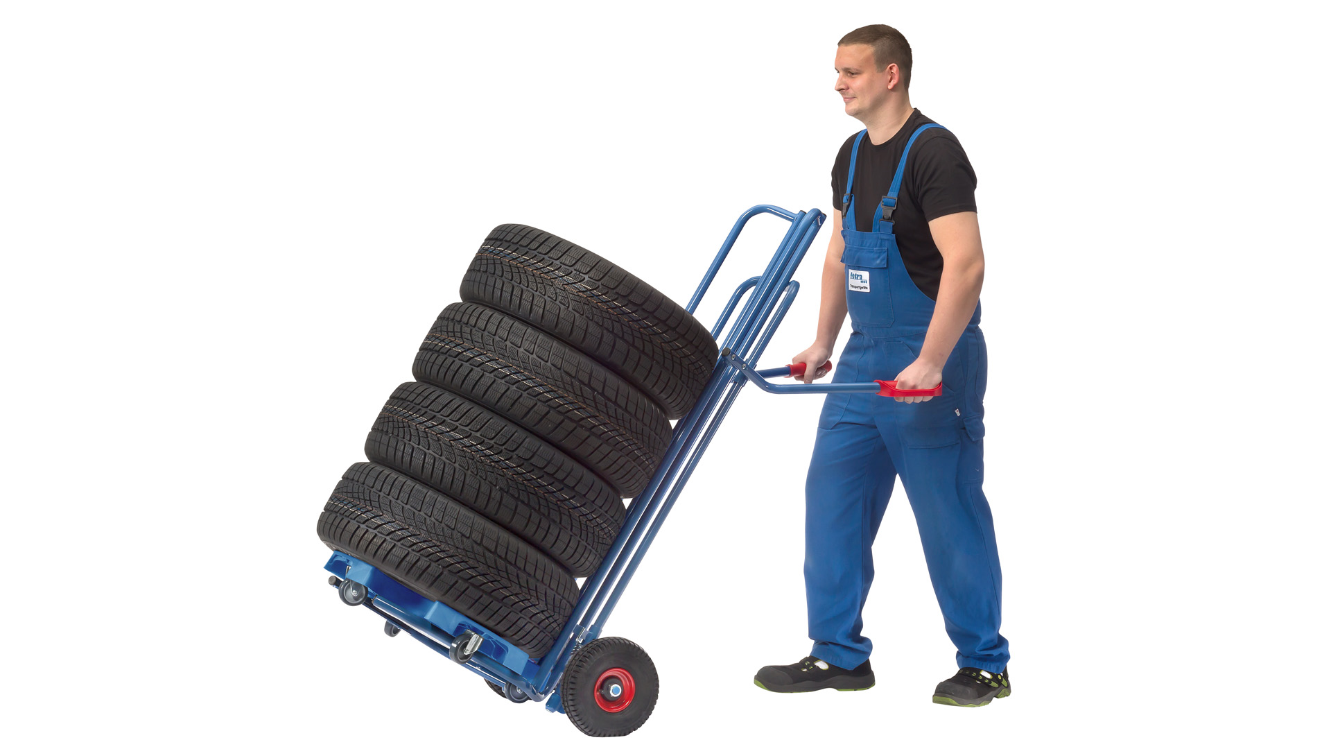 ∙ Stabile Schweißkonstruktion ∙ RAL 5007 brillantblau pulverbeschichtet ∙ Schlag- und kratzfest ∙ Die Spreiz-Aufnahme kann durch die Griffholme bedient und somit Reifenstapel direkt aufgenommen oder abgesetzt werden ∙ Maximale Aufnahme bis zu 8 Reifen ∙ Naben mit Rollenlagern · Schaufelbreite 500-885 mm · Schaufellänge 575 mm
