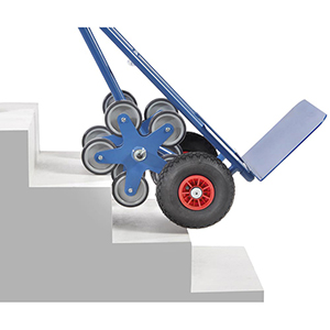 Stahlrohr-Treppenkarren ∙ Stabile Schweißkonstruktion aus Stahlrohr · Schlag- und kratzfeste Pulverbeschichtung in RAL 5007 brillantblau · Bügel oben und Querstreben durchgebogen - für den sicheren Transport von Gütern wie Rollen, Kannen, Eimern usw. · Stahlblechschaufel anschraubbar und dadurch austauschbar (Lieferung erfolgt unmontiert) ∙ Sicherheitsgriffe ∙ Mit 2 Lufträdern 260 x 85 mm auf Kunststoff-Felge (Naben mit Rollenlagern) und 2 fünfarmigen Treppensternen mit jeweils 5 TPE-Rädern Ø 125 mm Alle Stahlrohrkarren sind auch mit Vollgummi-Bereifung lieferbar. Gerne unterbreiten wir Ihnen dazu ein Angebot.