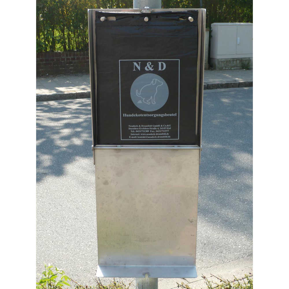 ∙ Korpus aus Edelstahl V2A ∙ Frontklappe mit Kennzeichnungsaufkleber ∙ Zum Nachfüllen ist die Frontklappe über eine Innensechskant-Schraube zu öffnen ∙ Befestigungsschelle zur Montage an Rohrpfosten Ø 60 mm im Lieferumfang enthalten ∙ Weitere Befestigungsmöglichkeiten bieten wir Ihnen auf Anfrage gerne an ∙ Aufnahmekapazität ca. 200 Flachbeutel (im Lieferumfang enthalten