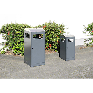 ∙ Korpus aus verzinktem Stahlblech, pulverbeschichtet RAL 7016 anthrazitgrau ∙ Mit verzinktem Innenbehälter ∙ Einwurföffnung an allen vier Seiten ∙ Niveauregulierung durch Stellfüße im Frontbereich ∙ Integrierte Ascherlade im oberen Bereich ∙ Gelochtes Kopfteil aus Edelstahl ∙ Flügeltüre per Vierkant verriegelbar ∙ Inklusive Montageprofil zu Bodenbefestigung
